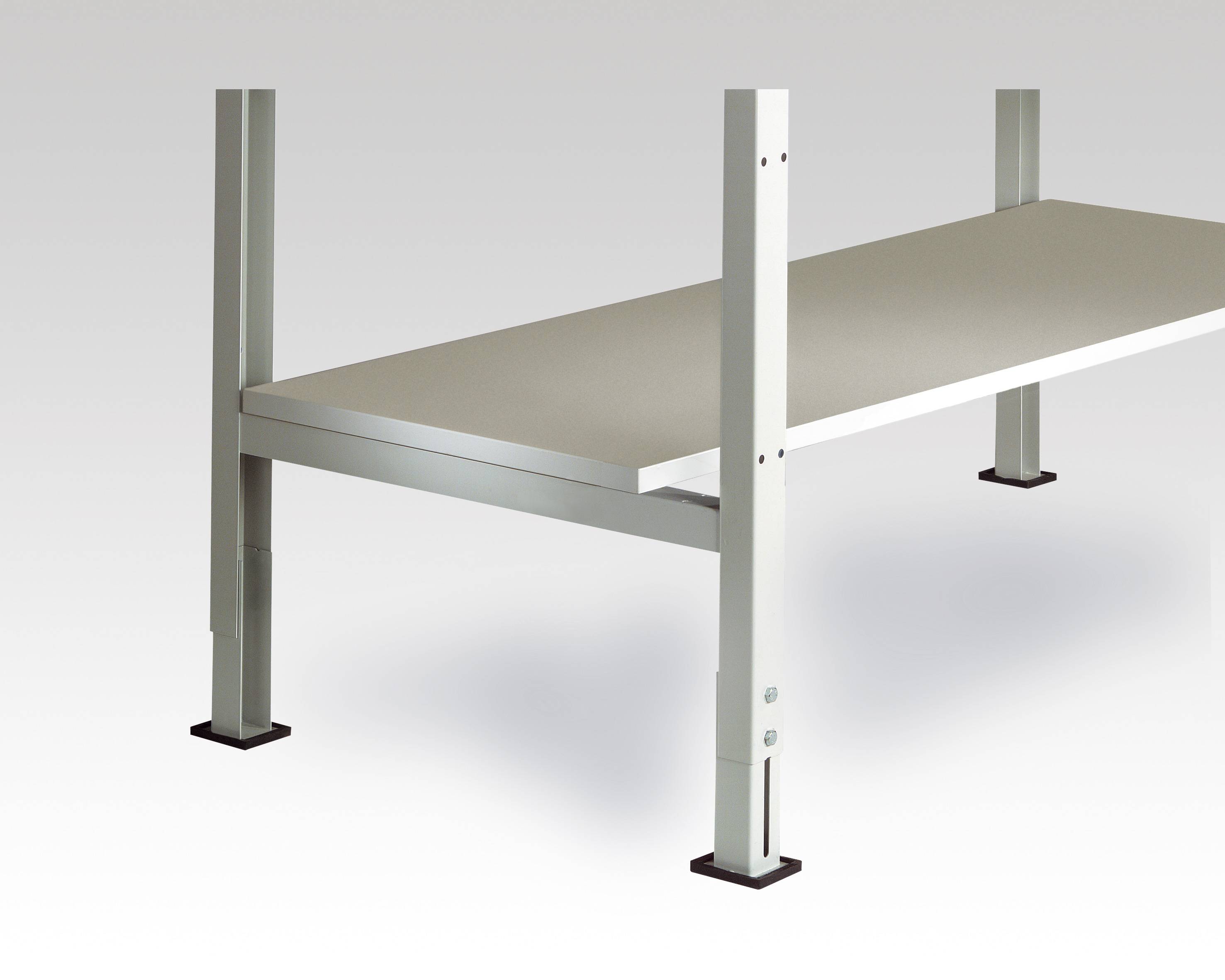 Die fortschreitende Entwicklung in der Elektronik tendiert zu immer kleineren Komponenten. Mit der ständig verkleinerten Größe diverser Bauteile werden auch die mikroskopisch kleinen Abstände zwischen den Isolatoren und Schaltungen innerhalb der Bauteile immer geringer, so dass geeignete Statikschutzmaßnahmen erforderlich werden. Winzige statische Entladungen sind für den einzelnen Menschen nicht spürbar, aber dennoch schädlich für elektronische Bauelemente und Komponenten. Erschwerend kommt hinzu, dass der entstandene Schaden, der durch die elektrostatische Ladung entsteht, mit dem bloßen Auge nicht zu erkennen ist. Elektrostatisch geschützte Bereiche und ESD-Einzelarbeitsplätze sind fast in der gesamten Elektronik- und Halbleiterfertigung erforderlich. Mit unseren ESD-Arbeitsplatzsystemen helfen wir Ihnen die elektrostatische Entladung zu vermeiden und Ihre Bauteile zu schützen. Nutzen Sie den Stauraum unter der Tischplatte! Durch die Anbringung eines ESD-Zwischenbodens unter der Tischplatte gewinnen Sie zusätzliche Ladefläche direkt am ESD-Arbeitsplatz. Der Boden wird auf die unteren Streben der Fußrahmen gelegt. Für die extra Stabilität ist der ESD-Zwischenboden mit einem Unterzug ausgestattet. Der ESD-Zwischenboden ist bei gleichmäßig verteilter Last mit 75 kg belastbar. Der ESD-Zwischenboden hat eine Breite von 1500 mm, eine Tiefe von 800 mm und eine Höhe von 25 mm. Der Boden besteht aus einer elektrisch leitfähigen Melaminharzbeschichtung auf volumenleitfähiger E 1 (Emissionsklasse 1) 3-Schichtspanplatte mit beidseitiger Feinstruktur. Er verfügt über einen hellgrauen, stoßfestem Kunststoff-Umleimer. Der Melamin-Zwischenboden ist elektrisch leitfähig, weitestgehend abrieb- und kratzfest nach DIN EN 438 sowie blendfrei und unempfindlich. Die glatte Oberfläche ist leicht zu reinigen. Der Ableit-Widerstand beträgt nach EN 100015 -1x10^9- 7,5x10^5 Ohm. Bitte beachten Sie, dass die Verwendung von ESD-Zwischenböden bei vorhandenen Fußstützen, Gehäuse-Unterbauten mit einer Nutzhöhe von 500 mm und fahrbaren Schubfachschränken nicht möglich ist. Der Einsatz eines Zwischenbodens bei vorhandenen Seitenblenden ist auf Anfrage möglich.