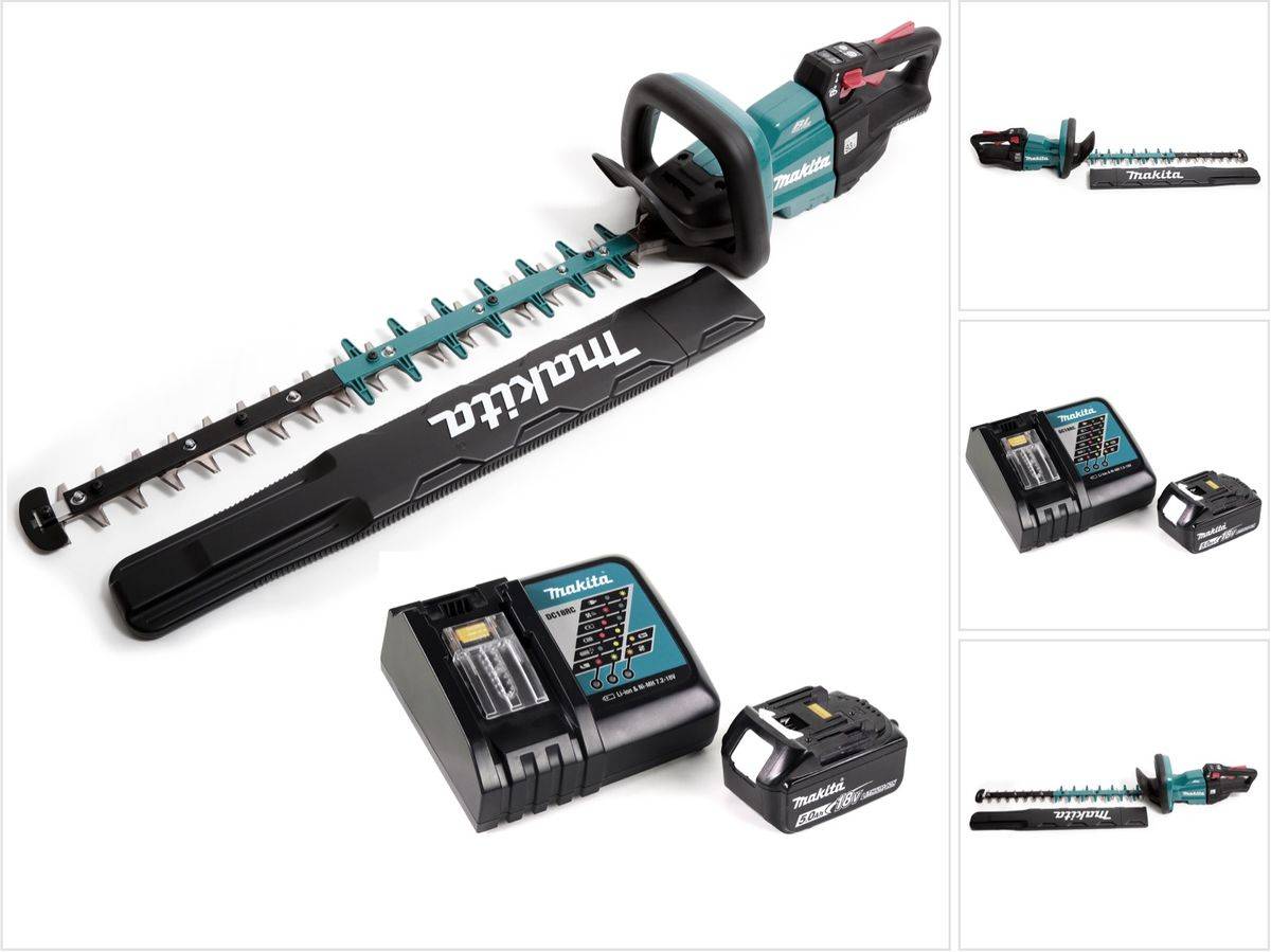 Die neue Makita DUH 601 mit neuer Messerzahnform leitet Zweige besser ein. Durch wenig Reibung der Klingen entsteht ein geringer Widerstand, was zu einer besseren Laufzeit und geringen Abnutzung des Materials führt. Der verstellbare Griff mit 5 verschiedenen Positionen ( Arretierung bei 0° sowie 45° und 90° links und rechts ) ermöglichen ein angenehmes Arbeiten in jeder Haltung. Durch eine intelligente Positionierung des Akkus am hinteren Griffende, wird eine gut ausbalancierte Handhabung ermöglicht. Makita verspricht ein kraftvolles und effektives Arbeiten, was einem Benzin-Gerät ähnelt. Durch das geringe Gewicht des Gerätes wird das Arbeiten kräfteschonend und eindeutig effektiver. Mit einer hohen und elektronisch regelbaren Hubzahl mit 3 Stufen, sind schnellere und einstellbare Schnitte möglich. Der bürstenlose Motor sorgt für mehr Ausdauer, längere Lebensdauer und eine kompaktere Bauweise. Es besitzt eine Konstantelektronik, wodurch die Drehzahl dem Widerstand angepasst wird. Das rostfreie Messer mit beidseitig geschärften Kanten lässt sich einfach auswechseln. Der Makita BL 1850 B Akku überzeugt durch seine lange Arbeitszeit. Ein zusätzlicher Vorteil ist die kurze Ladezeit von nur 45 Minuten im Makita Ladegerät. Der Akku verfügt dank geringer Selbstentladung und Kurzschluß-, Überspannungs- und Überhitzungsschutz über maximale Lebensdauer. Zudem besitzt der BL 1850 B noch eine LED - Ladestandsanzeige zum Überprüfen der Restenergie im Akku.