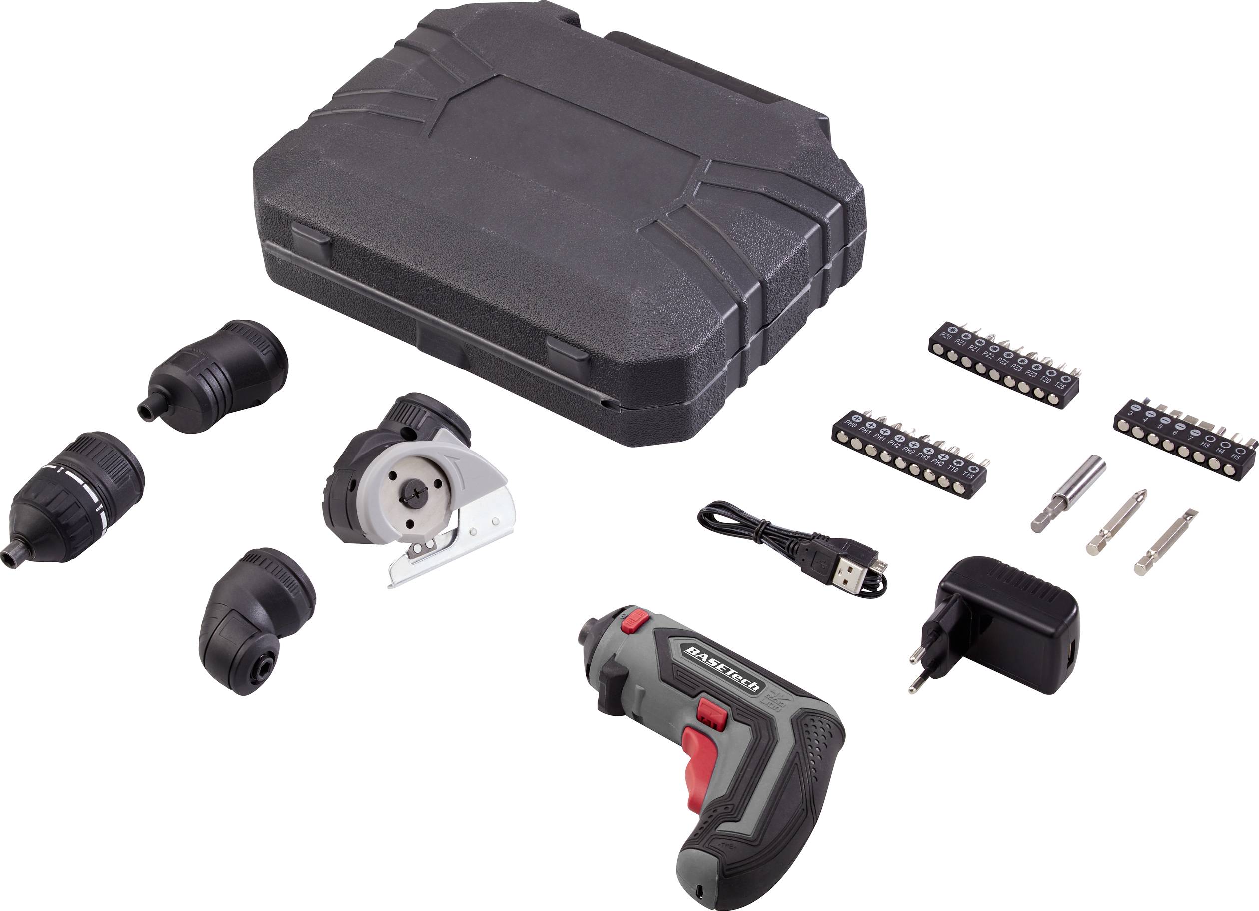Der Basetech ASS-830 Multifunktions-Akku-Schraubendreher wird mit mehreren Aufsätzen für verschiedene Montageaufgaben, einem Schneidaufsatz und einem Bit-Sortiment geliefert. Dazu gehören außerdem zwei LEDs zum Be- und Ausleuchten größerer Bereiche. Er ist ideal für schwer zugängliche Stellen und für das Arbeiten über Kopf. Schnelles und bequemes Aufladen über den Micro-USB-Anschluss.