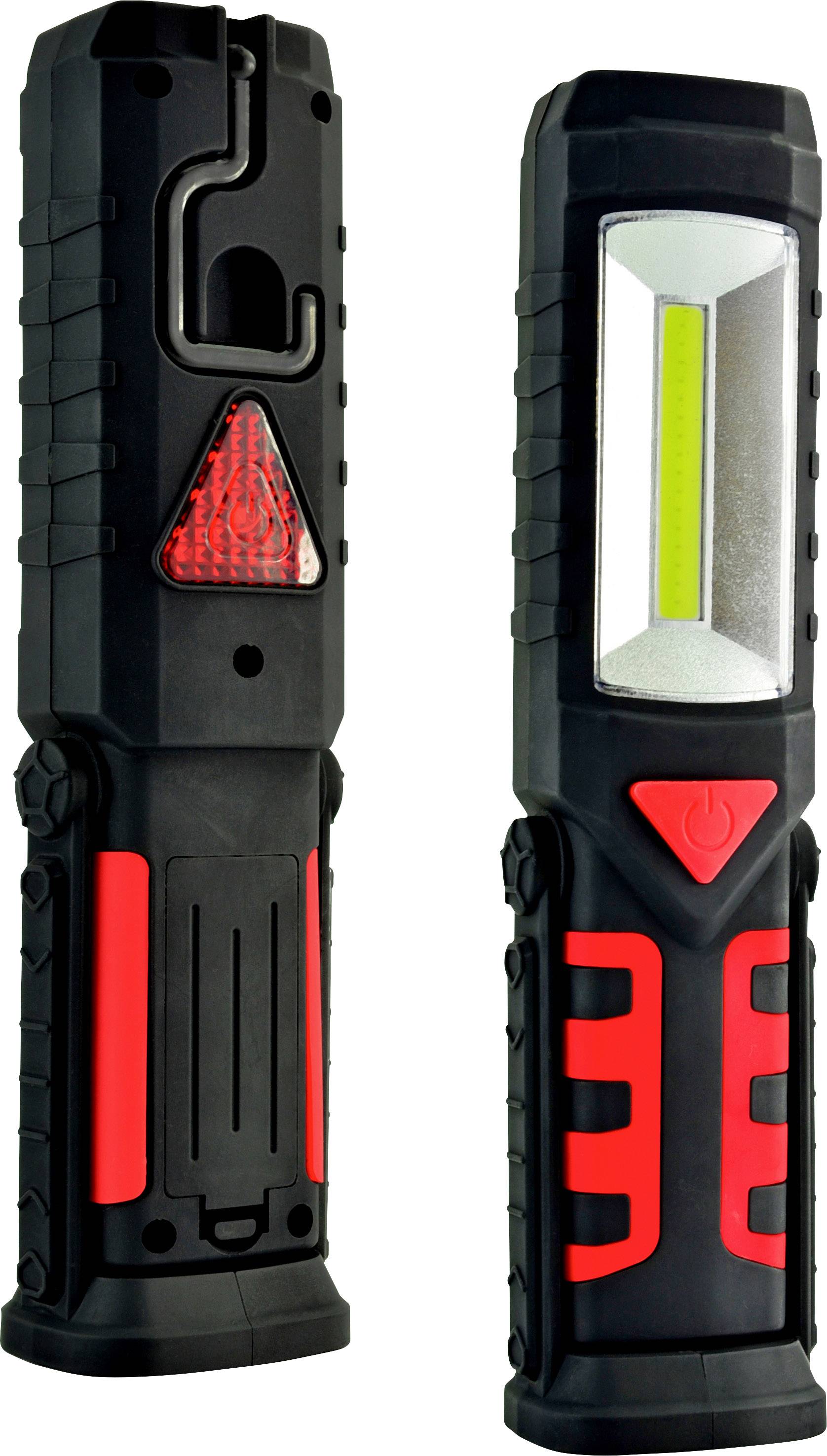 Bestens ausgerüstet in der Nacht oder jeder dunklen Ecke der Werkstatt: Diese 3in1 Leuchte vereint Taschenlampe, superhelle COB Arbeitsleuchte und rotes Warnblinken. Die COB Leuchte verfügt zusätzlich über zwei Helligkeitsstufen