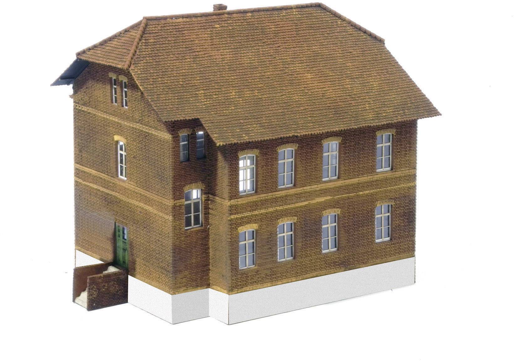 Verwaltungs- oder Bahnpersonalgebäude. 3D-gelaserter Karton und Holz. Modell sollte individuell bemalt werden.