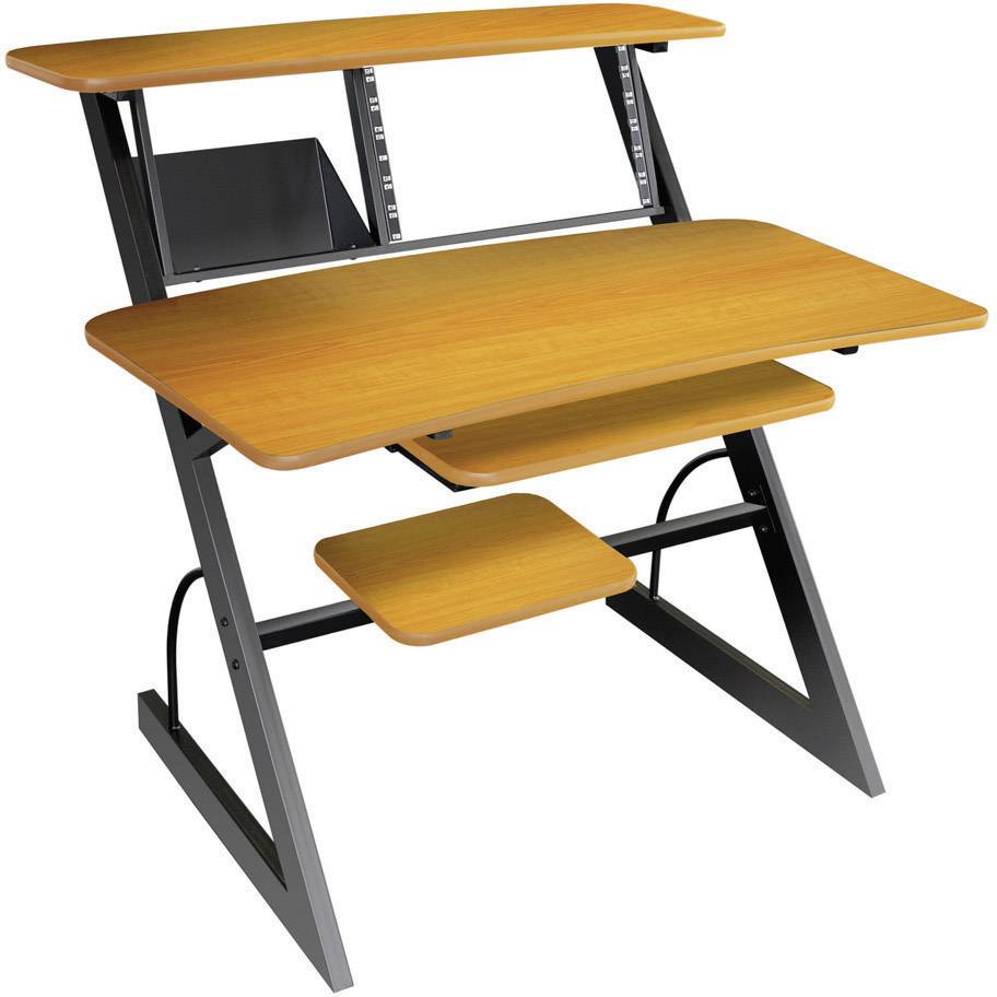 Komfortabel und ergonomisch lässt sich alles, was für ein Projekt- oder Homerecording-Studio notwendig ist, in der Studio Workstation installieren. Eine geräumige Arbeitsfläche, dazu Ablagen für Laptop und Monitore sowie ein Tastaturauszug unter der Arbeitsfläche nutzen den zur Verfügung stehenden Raum optimal aus. Darüber hinaus lässt sich ein Einbaurahmen mit sechs Höheneinheiten einfach und flexibel mit Steckfeldern oder dem bevorzugten Outboard-Equipment bestücken. Der Rahmen der Studio Workstation besteht aus schwarz pulverbeschichtetem Stahlrohr, die Arbeitsflächen sind in folierter Spanplatte in Schwarz oder Kirschdekor lieferbar. Der Z-förmige Stahlrohrrahmen erlaubt während der Arbeit an der Workstation optimale Bewegungsfreiheit.