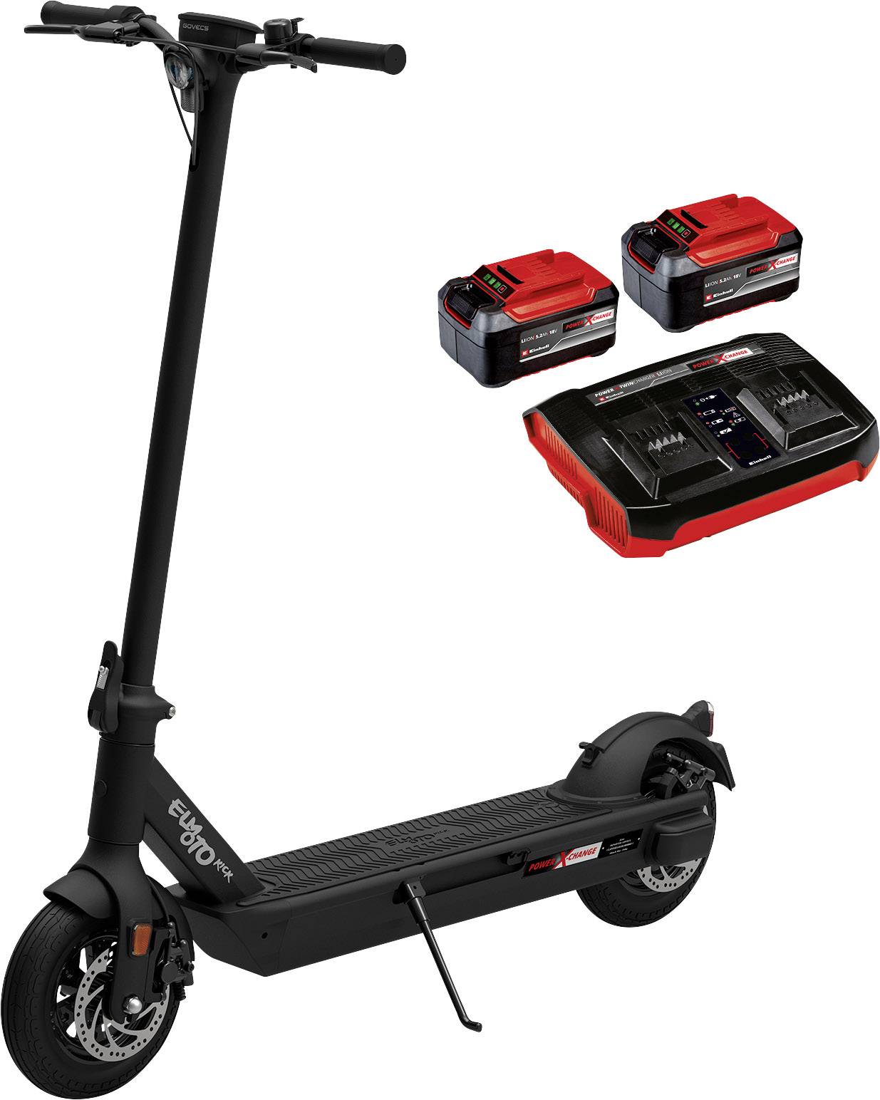 Der ELMOTO KICK wird mit den Power X-Change-Akkus von Einhell angetrieben. Als deutscher Werkzeughersteller steht Einhell für hohe Qualität. Gemeinsam mit der Expertise von GOVECS, Europas führendem Elektroroller-Hersteller, handelt es sich bei dem ELMOTO KICK um einen E-Scooter im Premiumbereich. Die Akkus mit den Lithium-Ionen-Akkuzellen sind nicht nur zuverlässig und robust, sondern gehören auch zu einem intelligenten, nachhaltigen System: Die Akkus können in allen Geräten der Einhell Power X-Change-Produktreihe verwendet werden – so bieten sich über 1000 Einsatzmöglichkeiten! Für den Betrieb des Kick-Scooters sind zwei 18 Volt Power X-Change-Akkus nötig, die hintereinander mit einem Klick eingesetzt werden. Die Ladezeit bis zum vollständigen Batteriestand beträgt zwei Stunden.