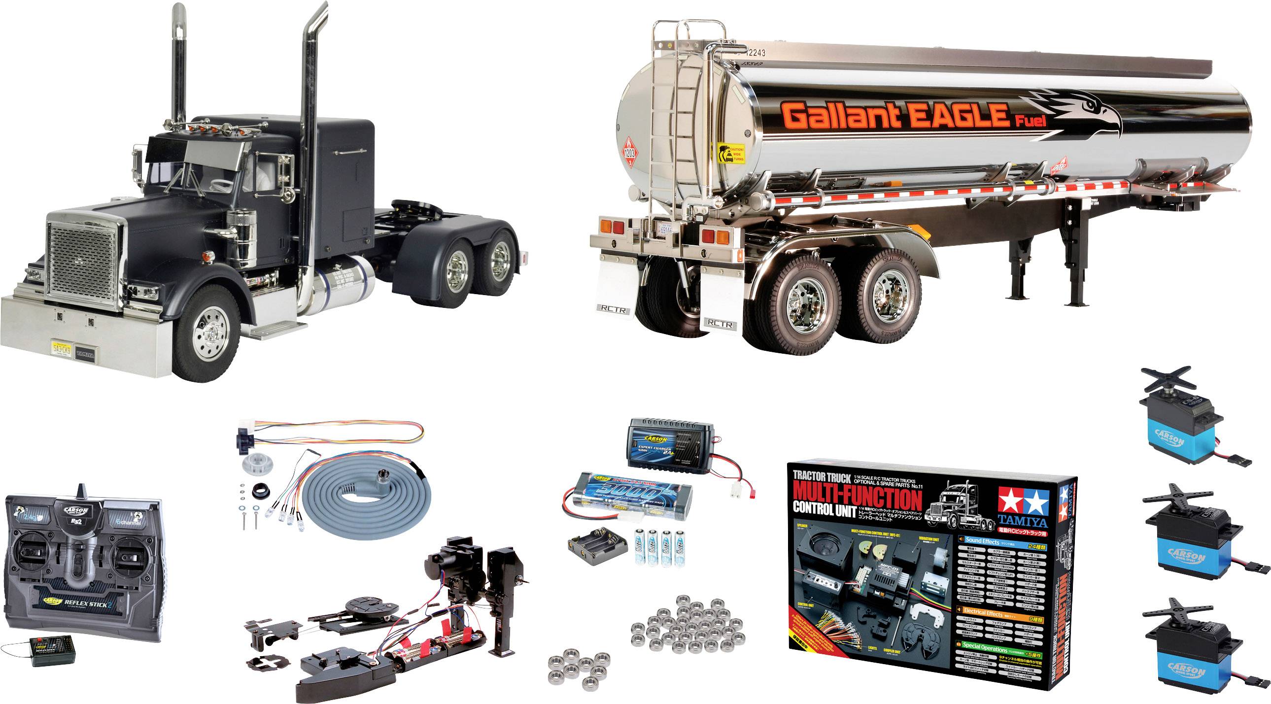 Bausatz im Maßstab 1:14 · Vorbildgetreue, verlängerte Karosserie, neue vordere und hintere Stoßstange, Kühlergrill, Luftfilter und Auspuffrohre · Auspuffrohre bestehen aus Metall · Karosserie, H, P und Q12/Q15 in schwarzem Kunststoff und vorlackiert in TS-40 Metallic Schwarz (Matt) · Robuster Metallrahmen mit Kunststoff-Versteifungen · Vorbildgetreuer Antriebsstrang mit vorn verbautem Motor und Doppelachsantrieb hinten · 540er Elektromotor · 3-Gang Schaltgetriebe, schaltbar während der Fahrt über ein extra Servo (Mehrkanalfernsteuerung benötigt) · Federung über Blattfedern und Dämpfer mit Spiralfedern · Inkl. Fahrerfigur im Maßstab 1:14 · Sattelplatte vorbereitet für die Aufnahme von TAMIYA und CARSON Sattelauflieger.