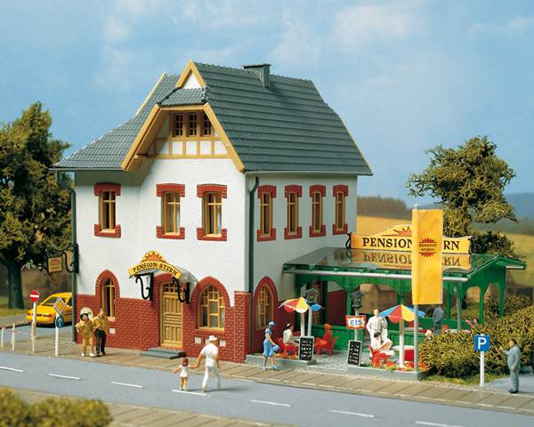 Mit überdachter Terrasse als Kaffeegarten. Tische, Stühle und Sonnenschirme liegen bei.
