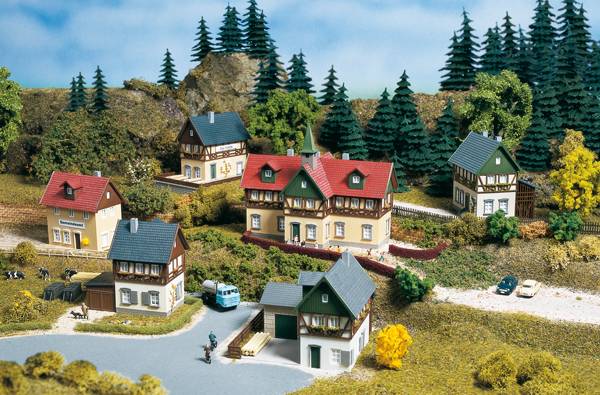Abm. (L x B x H) Schule 140 x 105 x 120 mm; Handwerkerhaus 107 x 100 x 82 mm; Fachwerkhaus mit Garage 80 x 50 x 85 mm; Fachwerkhaus mit Lattenschuppen 76 x 70 x 90 mm; Gasthaus 120 x 110 x 90 mm; Gemeindeamt 70 x 60 x 82 mm. Eine Bastelfeile liegt bei.