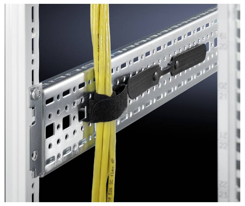 Durch den Klettverschluss können befestigte Kabelstränge problemlos gelöst werden, einzelne Kabel können hinzugefügt oder entfernt werden. Ideal für empfindliche Datenkabel (LWL/Cu), das Eindrücken des Kabelmantels wird vermieden. Zusätzlich kann der Klettverschluss an der System-Rundlochung verschraubt oder mit Schnellverbinder befestigt werden.