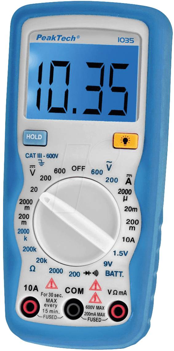 Kompaktes Multimeter mit 3 1/2-stelliger LCD Anzeige, entwickelt nach Sicherheitsstandard CAT III 600 V, im modernen Design und integriertem Schutzrahmen, ideal für den Ausbildungs- und Servicebereich.