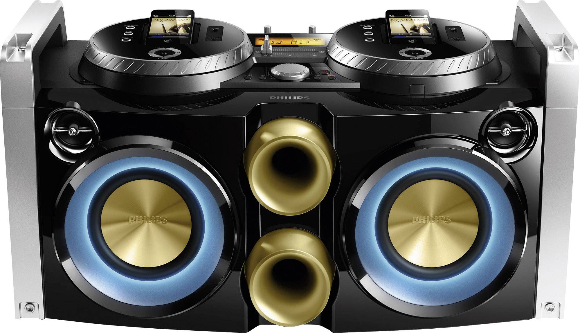 Starten Sie die ultimative Party. Mit den drehbaren Docks des Philips Soundsystems können Sie Musik von Ihrem iPhone/iPod wiedergeben, Ihr Gerät aufladen sowie Musik von der Bibliothek Ihres