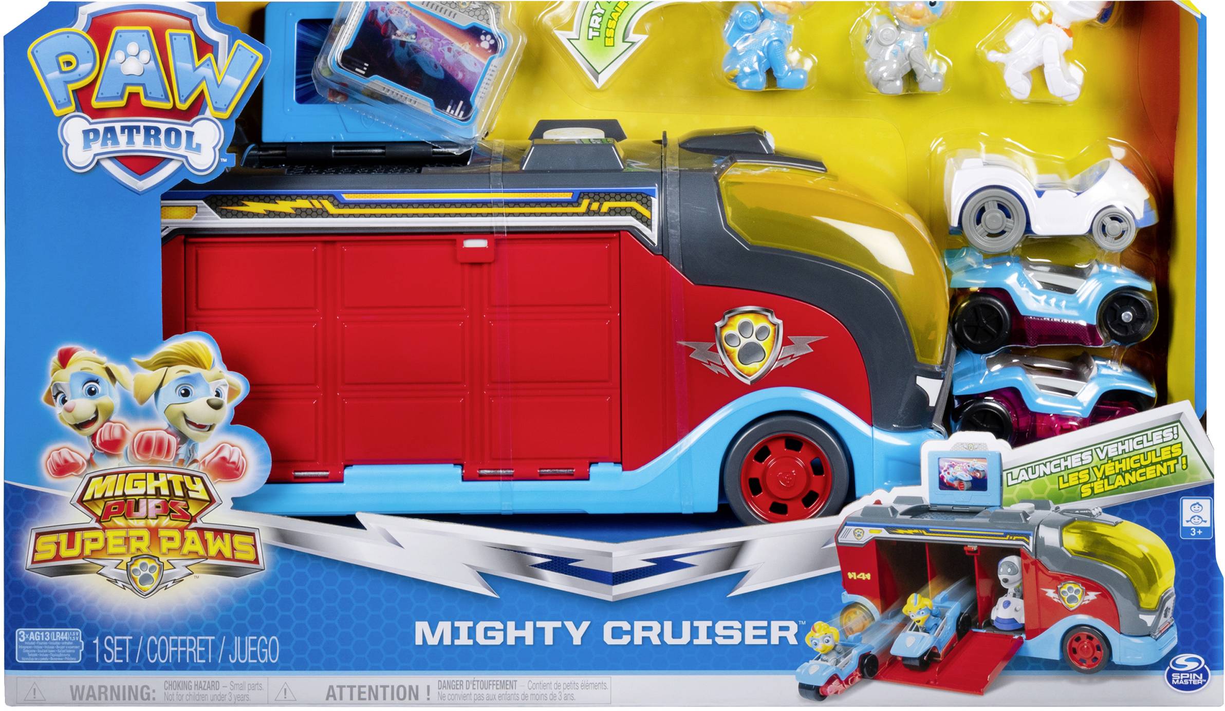 Der Mighty Cruiser ist toll zum Nachspielen der Superhelden-Abenteuer aus den Mighty Pups Super Paws Episoden der TV-Serie Paw Patrol. Mit ihrem Teamfahrzeug machen sich die Mighty Twins, neue Freunde der Paw Patrol, die ebenfalls Superkräfte haben, und Robo-Dog auf den Weg zu noch mehr actiongeladenen Missionen. Die Mighty Twins und Robo-Dog sind jeweils als abnehmbare Figuren mit ihren Mini-Fahrzeugen im Set enthalten. Die drei Fahrzeuge werden in die Fächer an der Seite des Mighty Cruiser geladen und schon kann es losgehen zum nächsten Einsatz. Mit einem Tastendruck an der Seite des Mighty Cruiser stürzen sich die Mighty Twins und Robodog direkt ins Abenteuer. Die Fahrzeuge der Mighty Twins können für den Einsatz auch verbunden werden. Um die nächste Mission anzusehen, wird einfach die enthaltene Wackelkarte in den Pop-up-Bildschirm geschoben und spannende Soundeffekte ertönen, wenn man den Knopf oben am Mighty Cruiser drückt. Und wenn die Mission vorbei ist, finden die Mighty Twins in der vorderen Kabine Platz und Robo-Dog hinten. Mit dem Mighty Cruiser steht dem nächsten Einsatz nichts im Weg. Geeignet für Kinder ab 3 Jahren.