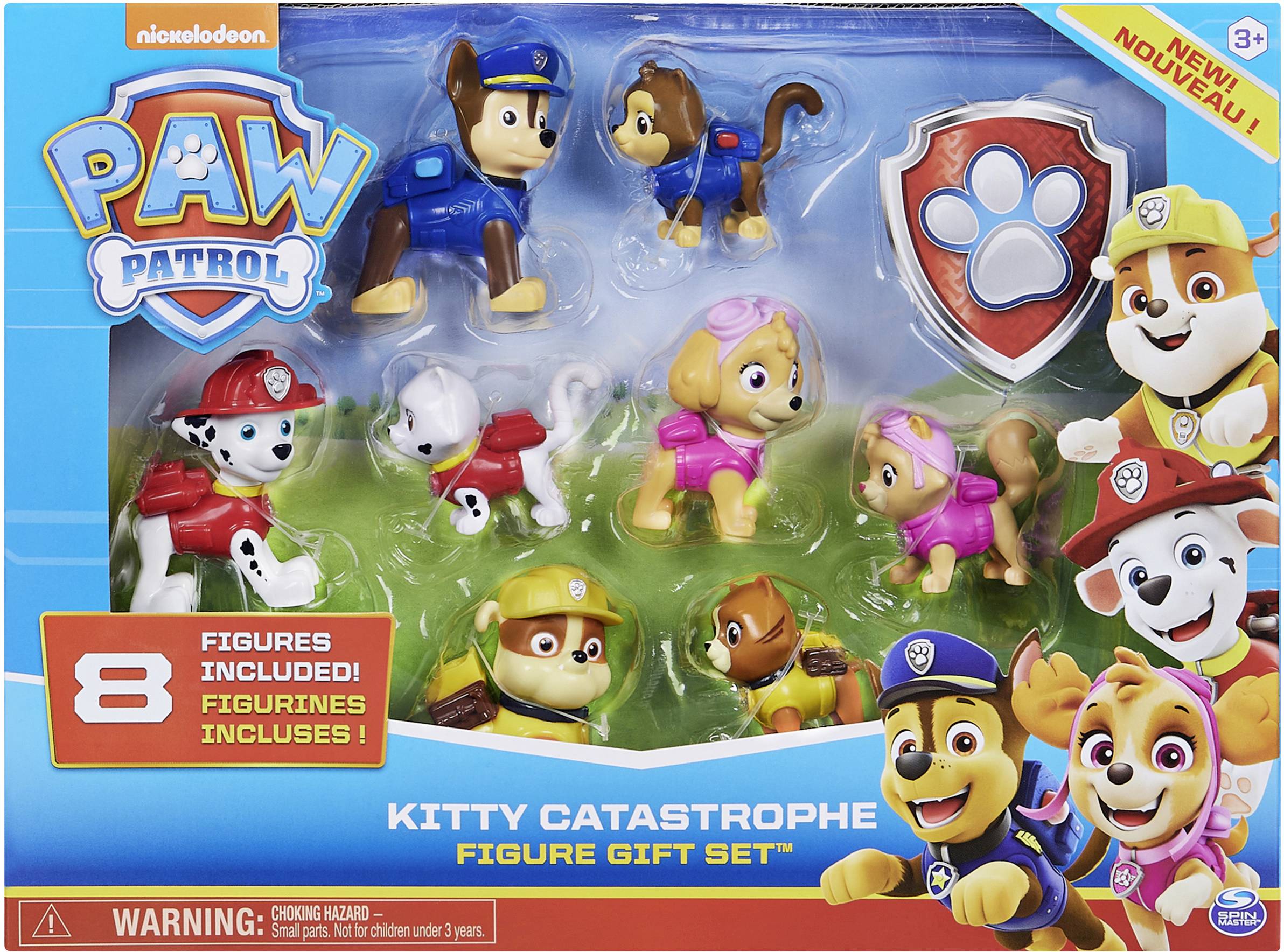 Den heldenhaften Welpen der Paw Patrol wird in der TV-Serie regelmäßig durch die Kitty Catastrophe Crew (deutsch: Chaos-Kätzchen) das Leben schwer gemacht, denn die frechen Kätzchen des Bürgermeisters sorgen gern für Unruhe und Chaos in Adventure Bay. In diesem Geschenkset sind sie nun erstmals auch als Spielfiguren erhältlich. Enthalten sind die Hundefiguren von Chase, Marshall, Rubble und Skye sowie ihre vier Katzen-Gegenspieler. Darüber hinaus ist ein Papp-Anstecker mit dem Paw Patrol Logo enthalten. Die Figuren entsprechen dem Maßstab der Action Pack Pups und Hero Pups und sind kompatibel mit den gängigen Fahrzeugen und Spielsets von Spin Master (u.a. mit den Basic Vehicles, dem Lookout Tower Spielset, dem Paw Patroller Teamfahrzeug, dem Ultimate Fire Truck und Ultimate Construction Vehicle oder dem Mission Cruiser). Geeignet für Kinder ab 3 Jahren.