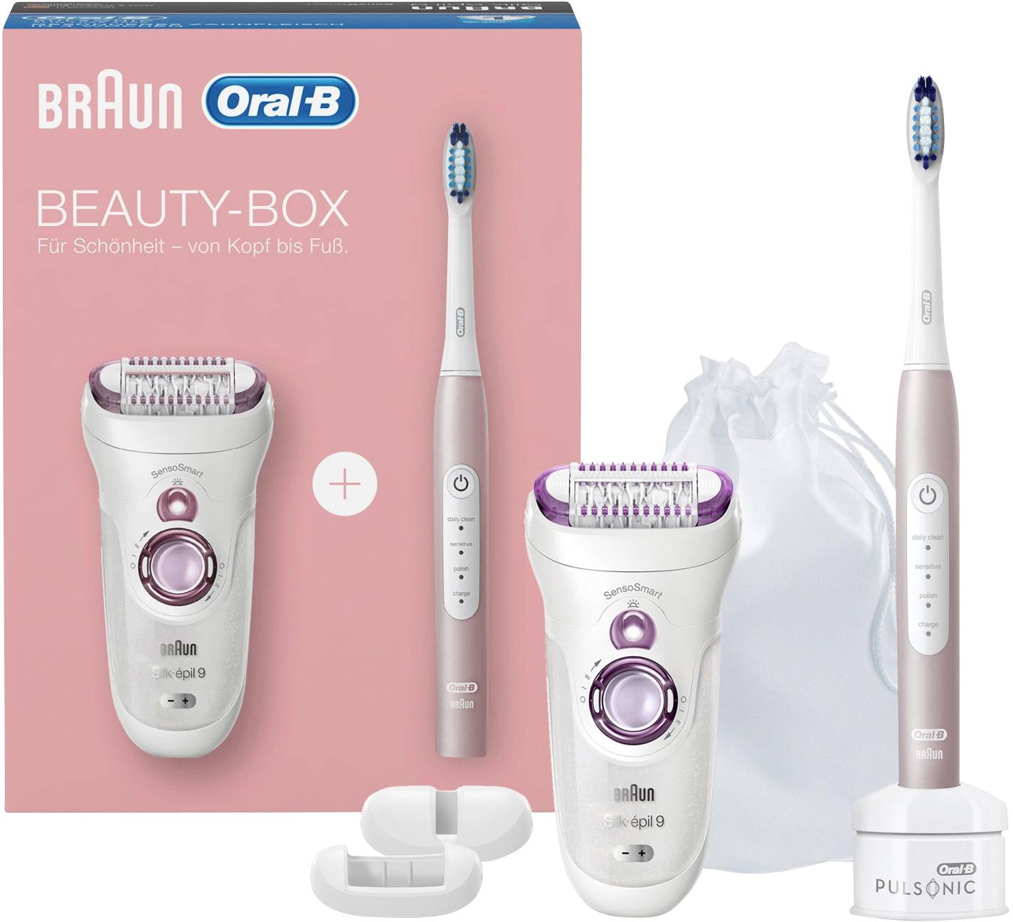 Entdecken Sie die neue Beauty-Box von Oral-B und Braun. Für Schönheit - von Kopf bis Fuß. Die Beauty-Box enthält eine Oral-B Pulsonic Slim Luxe 4000 Elektrische Zahnbürste und einen Braun Silk épil 9 SensoSmart Epilierer. Die Zahnbürste sorgt für gesünderes Zahnfleisch in 4Wochen. Dank des ultra-schlanken, super-leichten Handstücks liegt sie besonders gut in der Hand und eignet sich deshalb für zu Hause und auf Reisen. Sie können zwischen drei Modi für einen individuellen Putzkomfort wählen: Tägliche Reinigung, Sensitiv und Aufhellen.