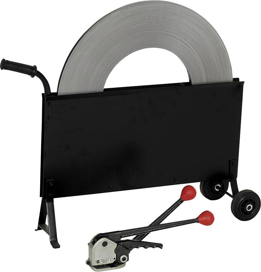 Fahrbarer Stahlbandabroller für 13, 16 und 19 mm Bandbreite, mit Ablagekasten