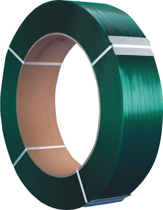 für schwere Kartonagen, Paletten usw. · hohe Bruchfestigkeit · witterungsbeständig, keine scharfen Kanten · aus Polyester · geringe Bandausdehnung · Innenkern-Ø 406 mm
