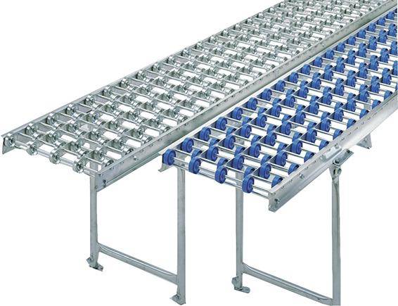 Leicht-Röllchenbahn mit Kunststoffröllchen, Serie 21200, Kurve 90° | Für Stückgüter mit festem, glattem Boden Neigung durch Gefälle ca. 2–5 % (abhängig von Beschaffenheit/Gewicht des Förderguts). Fördergut sollte mindestens auf 3 Achsen aufliegen. | Stabile Konstruktion Verzinktes Rahmengerüst aus U-Profil (20/60/20 mm) mit eingeschraubten Quertraversen. Achsen zusätzlich durch Mittelstege abgefangen. Wahlweise mit kugelgelagerten, verzinkten Stahlröllchen (Ø 48 mm) oder blauen Kunststoffröllchen (Ø 48 mm). Andere Längen auf Anfrage lieferbar.