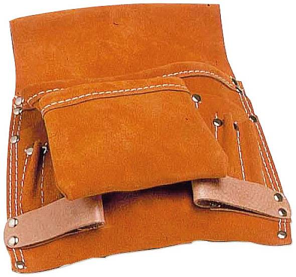 Werkzeugtasche aus Qualitätsleder inklusive zwei Hammerholstern an den Seiten. Mit 8 verschiedenen Aufbewahrungstaschen. Widerstandsfähig vernietet.