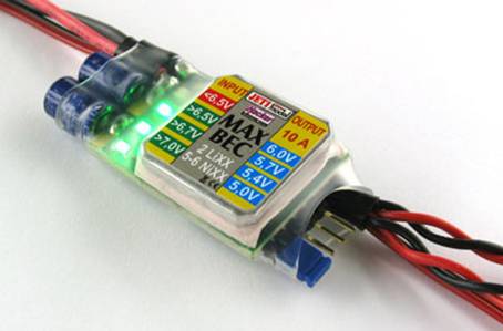 Das Jeti MAX BEC kann die Empfangsanlage aus einem Akku mit 2 Lipo/LiFepo Zellen oderr 5-6 NiXX Zellen versorgen. Die Eingangsspannung wird durch super helle LED's überwacht. Bei einer Eingangsspannung von über 7.0V leuchten alle grünen LED's. Bei sinkender Eingangsspannung verlöschen nach und nach die grünen LED's. Fällt die Eingangsspannung unter 6.5 V leuchtet die rote LED auf und signalisiert einen leeren Akku. Die Augangsspannung ist durch einen Jumper wählbar. Geeignet für kleine (30'er) bis mittlere Modellgrössen