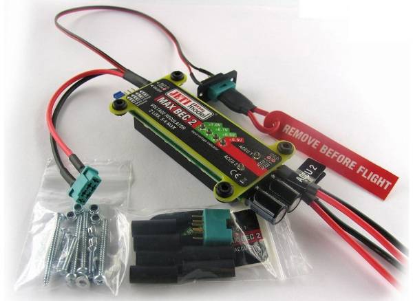 Das JETI Max BEC 2 ist eine Akkuweiche mit Spannungsregelung. Der EIN/AUS-Schalter ist in Form eines MPX-Brückensteckers ausgeführt. Für maximale Schaltsicherheit wird der EIN-Zustand bei entfernter MPX-Steckbrücke erreicht. Es können 2 unabhängige 2S LiPo / LiIon Akkus zur Stromversorgung eingesetzt werden. Die eingehende Spannung und der gerade aktive Akk wird durch eine LED Reihe angezeigt.