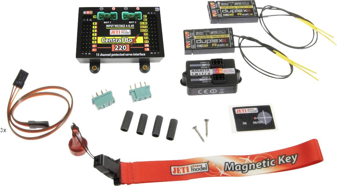 Die Central Box 220 ist der Nachfolger der beliebten Central Box 200. Speziell für den Einsatz auch leistungsstarker und stromhungriger Servos wurde bei der Central Box 220 ein Aluminiumgehäuse eingesetzt und die Überstromabsicherung der Servossteckplätze verstärkt. Die Central Box 220 bietet echte Akku-Redundanz, DITEX-Servotelemetrie, JETI EX-Telemetrie und bis zu drei Empfängereingänge (2x 2,4GHz und 1x 900MHz) für vollständige Strom- und HF-Signalredundanz.
