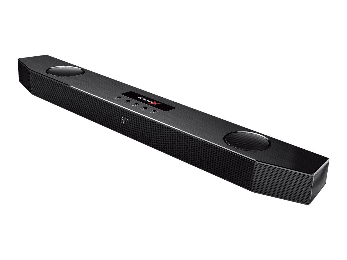 Creative Labs Sound BlasterX Katana. Audio Kanäle: 2.1 Kanäle, RMS-Leistung: 75 W, Eingebaute Audio-Decoder: Dolby Digital 5.1. Soundbar Lautsprecher RMS Leistung: 45 W, Hochtönerdurchmesser (Imperial): 3,3 cm (1.3 Zoll), Hochtönerdurchmesser: 3,4 cm. Subwoofer Effektivwert Energie: 30 W, Subwoofer Frequenzbereich: 20 - 150 Hz. Produktfarbe: Schwarz, Empfohlene Nutzung: TV, Unterstützte Audioformate: AAC,FLAC,MP3,OPUS,SBC,WAV,WMA. Übertragungstechnik: Verkabelt & Kabellos
