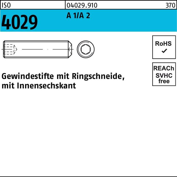 ISO 4029 A 1/A 2 Gewindestifte mit Ringschneide und Innensechskant - Abmessung: M 20 x 25 VE=S (10 Stück) Weitere technische Eigenschaften: · Gruppencode: 04029.910