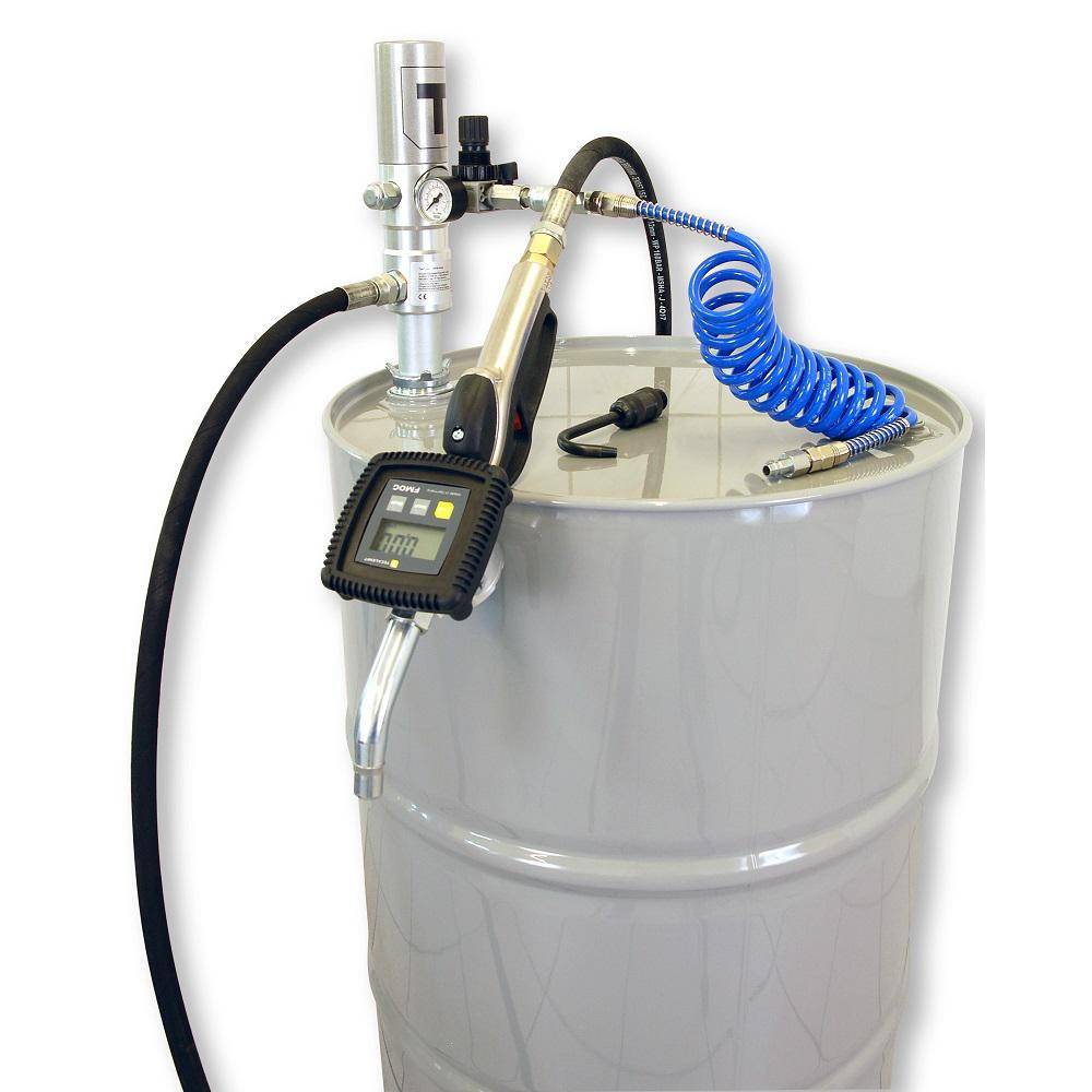 Einsatzbereich Das Druckluftpumpen-Set TecPump DP16 standard ist eine pneumatisch betriebene Kolbenpumpe zur Förderung von Frischölen aus Fässern und Tanks in Werkstatt und Industrie. Beschreibung Das Druckluftpumpen-Set TecPump DP16 standard besteht aus der pneumatisch betriebene Kolbenpumpe TecPump DP16 D, einem Saugrohr für 60 und 200 l Gebinde mit verstellbarer 2 Zoll Fassverschraubung, einem 4 m Abgabeschlauch, elektrischen, nicht eichfähigen Handdurchlaufzähler FMOG mit montiertem nachtropfsicheren Motorenölauslauf, beigelegtem Getriebeölauslauf, einem Druckregler mit Absperrhahn, einem 2,5 m Druckluftspiralschlauch mit Druckluftkupplung und Stecknippel DN 7,2. Technische Daten Übersetzungsverhältnis - 1:1 Förderleistung - 16 l/min Saugrohrlänge - 940 mm Saugrohr-Ø - 42 mm Fassverschraubung - 2 Zoll Viskosität - max. 5.000 mPas Arbeitsdruck - 6 bis 8 bar Luftanschlussschlauch - 2,5 m inkl. Anschlüsse Luftverbrauch - 300 l/min Abgabeschlauch - 4 m - 1/2 Zoll AG und IG Abmessungen BxTxH - 130 x 130 x 1300 mm Gewicht - 4,9 kg