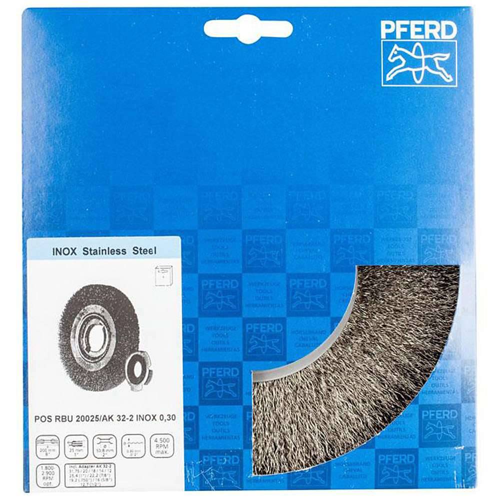 Bezeichnung: POS RBU 20025/AK32-2 INOX 0,30, Bürsten-Ø: 200 mm, Besatzmaße (B x L): 25 x 50 mm, max. Bohrungs-Ø: 50,8 mm, Besatzmaterial-Ø: 0,3 mm, empf. Drehzahl: 1800 - 2900 min-¹, max. zul. Drehzahl: 4500 min-¹
