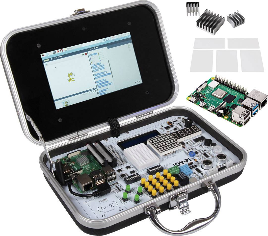 Joy Pi Koffer + Raspberry Pi® 4 B (8 GB) + Bluetooth Tastatur + microSD Karte 32GB + Netzteil + Kartenleser + RFID Karte & Clip + Stepper Motor + Servo Motor + IR Fernbedienung + Bedienungsanleitung. + Kühlkörper-Set + RFID Blanko-Karten (5 St.)