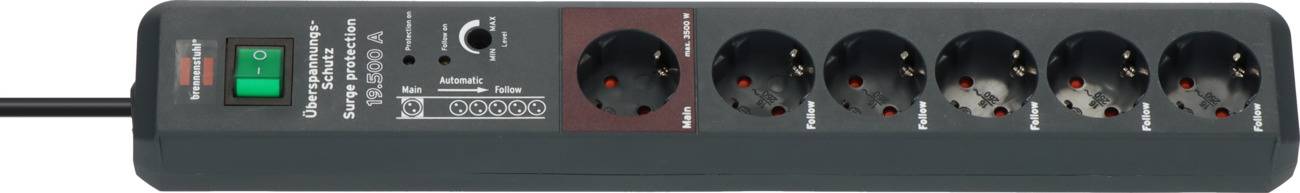 Die Secure-Tec 6er Mehrfach-Steckdosenleiste von Brennenstuhl in der Farbe anthrazit und 3m Kabel besticht durch ihre Qualität und Sicherheit in allen Bereichen. Das Gerät hat ein praktisches Automatik-Schaltsystem mit Main-Follow-Funktion. Das Main-Gerät (z.B. einen Computer) kann die Follow-Geräte (z.B. Monitor, Soundsystem, Drucker, Scanner usw.) in die automatische Steuerung mit einbeziehen. Mit dem Ein/Aus Schalter des Gerätes (in roten Main-Steckdose eingesteckt) können alle Geräte (in den Follow-Steckdosen) automatisch mit ein und ausgeschaltet werden.