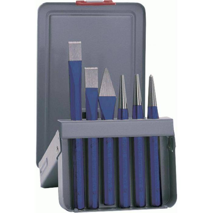 Einsatzbereich Werkzeugsatz mit Flachmeißel, Kreuzmeißel, Körner und Durchtreiber Beschreibung 6-teilig Schlagkopf vergütet in Stahlblechkassette Technische Daten Inhalt 1 Flachmeißel 125 mm 1 Flachmeißel 150 mm 1 Kreuzmeißel 125 mm 1 Körner 120x10 mm 1 Durchtreiber 120x10x3 mm 1 Durchtreiber 120x10x4 mm