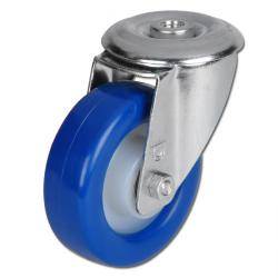Einsatzbereich Die Lenkrolle mit Rückenloch eignet sich bestens für den Einsatz auf Fliesen, Parkett, rauem Beton und unebenen, harten Böden. Anwendung Der kugelgelagerte Radkörper besteht aus Polyamid 6, die zylindrische Lauffläche aus blauem Polyurethan mit ca. 95° Shore A. Das Gehäuse, dessen Gabelkopf zweifach kugelgelagert ist, ist aus verzinktem Stahlblech gefertigt. In die Abdichtung ist ein Kugelabstandshalter integriert. Die Rolle bietet eine hohe Tragkraft und einen leichten Lauf bei nur geringem Abrieb. Technische Daten Material Radkörper - Polyamid 6 Material Lauffläche - Polyurethan, ca. 95° Shore A Material Gehäuse - Stahlblech verzinkt Lager - Kugellager Rad-Ø - 80 bis 200 mm Radbreite - 35 bis 50 mm Bauhöhe - 100 bis 235 mm Ausladung - 36 bis 54 mm Rückenloch-Ø - 12 mm Tragkraft - 150 bis 400 kg