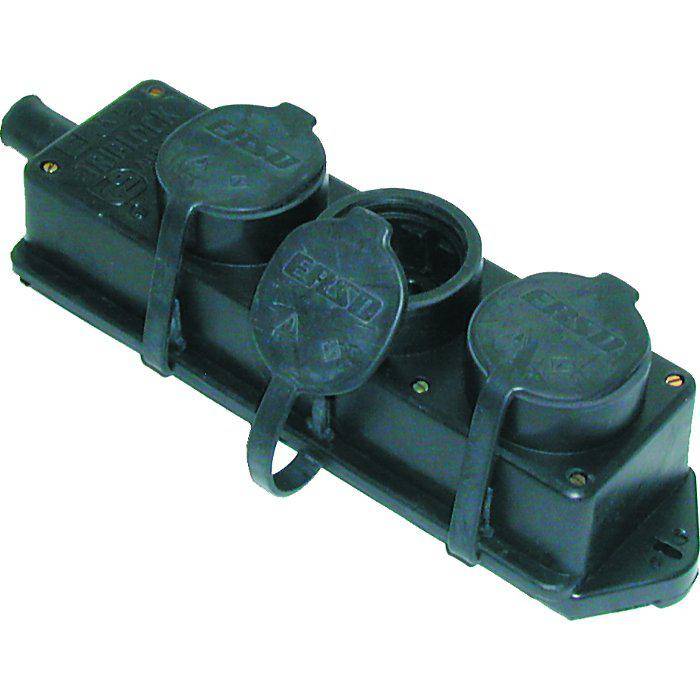 Einsatzbereich Stromverteiler ERSO Triblock für zahlreiche Konbinations- und Montagemöglichkeiten Beschreibung Triblock ohne Anschlussleitung Stromverteiler mit 3 Schutzkontaktsteckdosen und Gummideckeln Technische Daten Material - Vollgummi Sicherheit - IP 44, spritzwassergeschützt Leitungsdurchmesser - max. 6 bis 16 mm Für Spannung - 230V