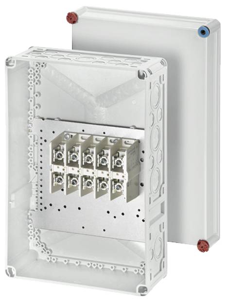 Kabelabzweigkasten aus hochwertigem Thermoplast mit Klemmen für Aluminium- und Kupferleiter. Für Aufputz-Anwendungen in Gebäuden oder die geschützte Installation im Freien. Kabelstutzen und Anbauflansche im Zubehör. Mit Klemmen bis 95 mm², 5-polig. Leiter können von vorn in die Klemmstelle eingelegt werden.
