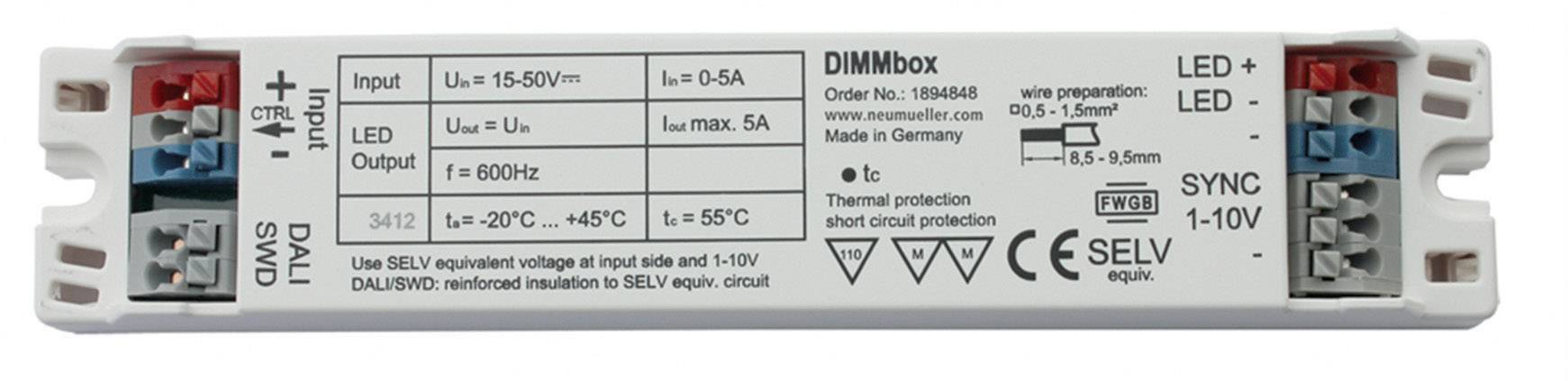 Die Kombi-Funktionalität ermöglicht den Dimm-Betrieb von LED-Treibern der LT-Serie. Optimiert für den Betrieb von LED-Systemen. Zur Steuerung kann der 1 - 10 V Analogeingang, das "Digital Adressable Lighting Interface" (DALI) oder der "SwitchDim" Eingang (Steuerung mittels getasteter Netzspannung), benutzt werden. Synchronisation mehrerer DIMMboxen per SYNC-Verbindung möglich.