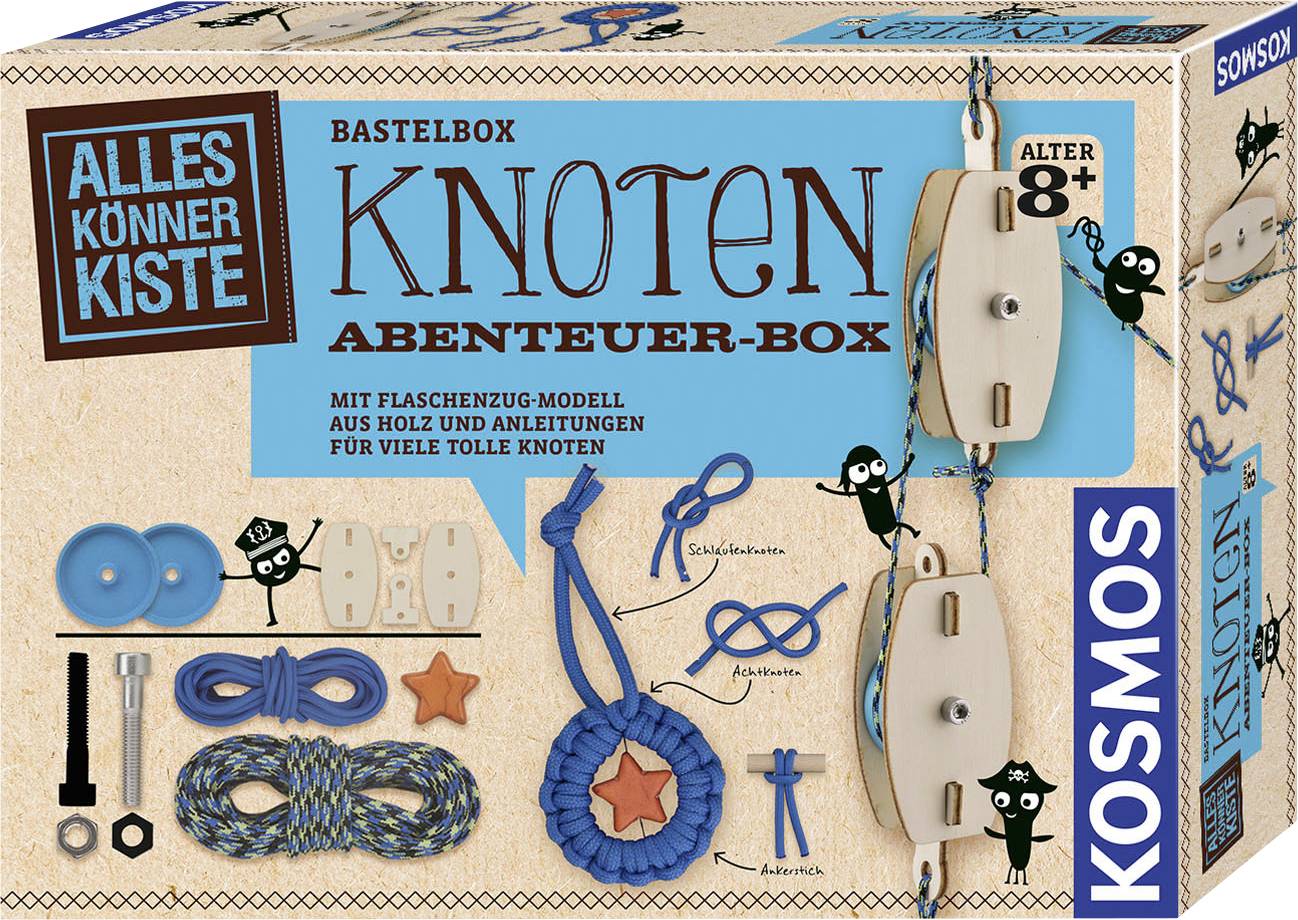 Lustige Knoten-Knobelei mit Überraschungsmoment! Palstek, Kreuzknoten und Co. – mit diesem coolen Bastelset lernen Kinder ab acht Jahren Schritt für Schritt die wichtigsten Knoten, die man fürs Leben braucht. Überraschung: Für das „Meisterstück“, einen selbstgeknüpften Schlüsselanhänger, können die neu erlernten Tricks gleich angewendet werden. Als besonderes Highlight enthält der Kasten ein tolles Flaschenzug-Modell aus Holz. So können die frisch gebackenen Knoten-Profis gleich noch ausprobieren, wie man mit wenig Kraft Dinge nach oben befördern kann.