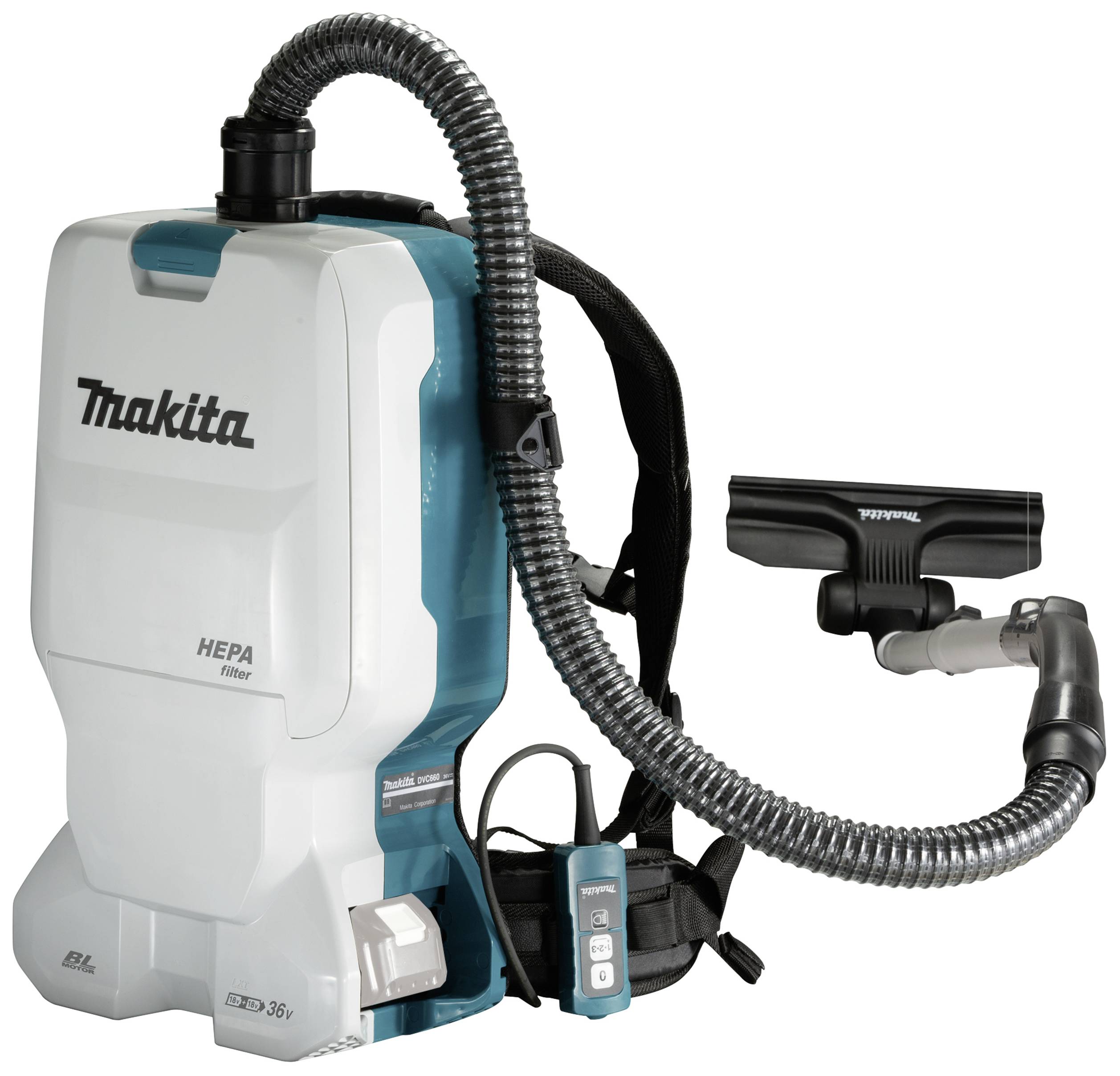 Akku-Rucksackstaubsauger mit bürstenlosem 2 x 18 V-Antrieb. Gerät wird mit gepolsterten Schultergurten bequem auf dem Rücken getragen. Das teleskopierbare Saugrohr ermöglicht immer die richtige Arbeitsposition. Eine Rüttelplatte am Staubbeutel sorgt durch die Bewegung des Anwenders für bessere Ausnutzung des Volumens.
