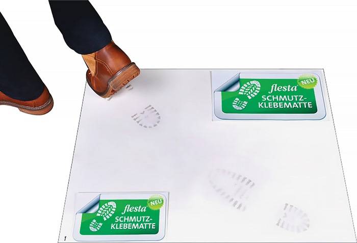 Schmutzmatte klebend natur Folie L610xB760xS3,2mm BÖCK Diese Matte ist eine 3,2 Millimeter dicke Schmutzschleuse, welche mit 60 beschichteten Haftfolien (abziehbar und durchnummeriert) rutsch-fest am Boden liegt. Mit nur zwei Schritten auf der Haftfolie w
