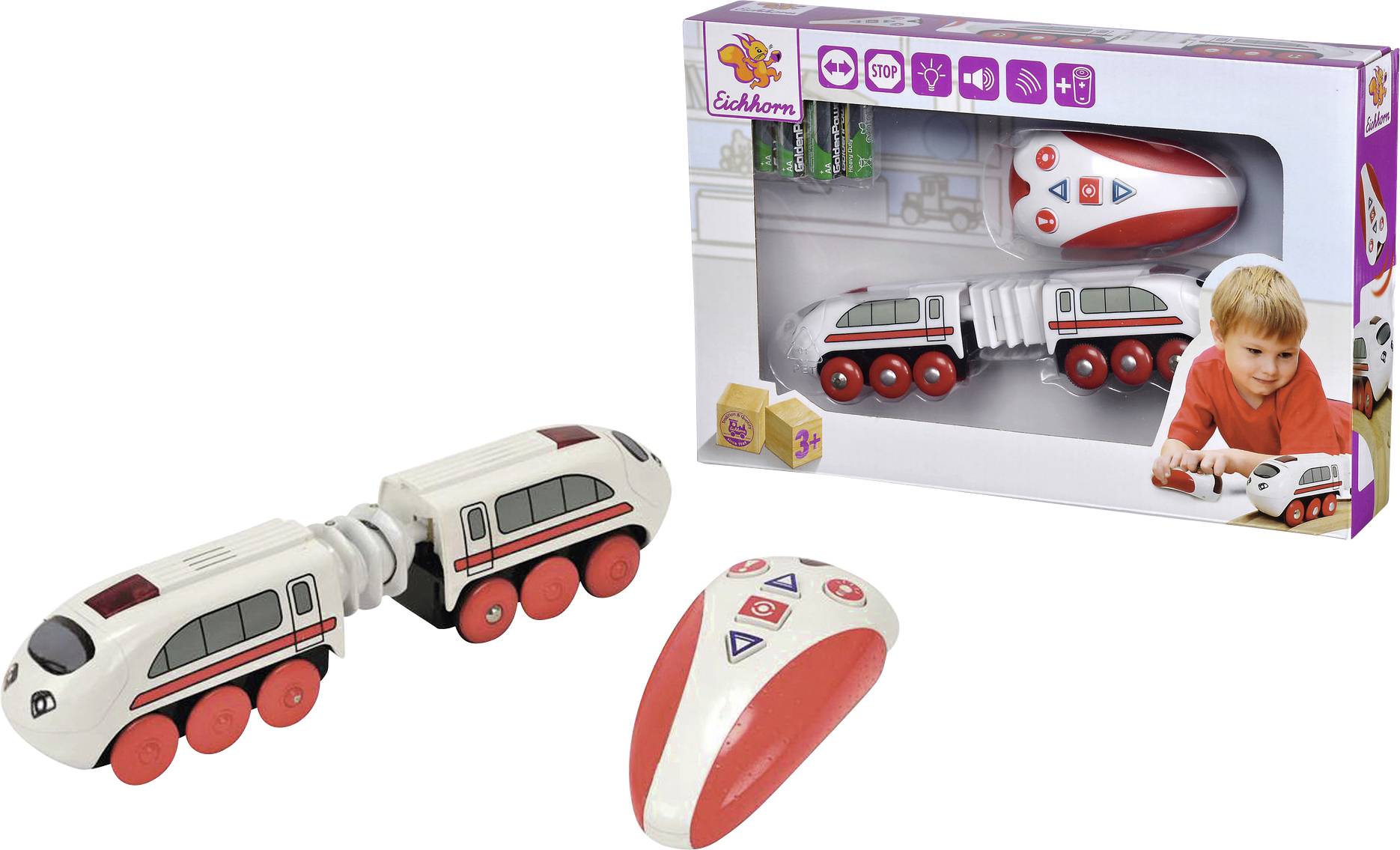 Eichhorn Bahn, Ferngesteuerter Zug: Der moderne ferngesteuerter Zug wird mit einem Handsender bewegt und bietet 5 Funktionen: Start, Stop, Vorwärts, Rückwärts und unterschiedlichen Sounds. Der Zug ist 20,5cm lang und kann auf den Eichhorn Schienenbahnen und vielen anderen Holzschienenbahnen bewegt werden. Der Zug wird mit 4x 1,5V LR06 inkl. Batterie geliefert. Für Kinder ab 3 Jahren geeignet.