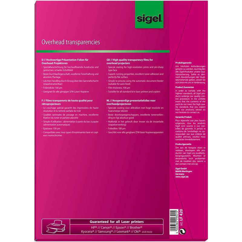 Sigel LF420. Produktfarbe: Transparent, Drucktechnologie: Laser, Format: A4 (210×297 mm). Medienanzahl pro Paket: 50 Blätter