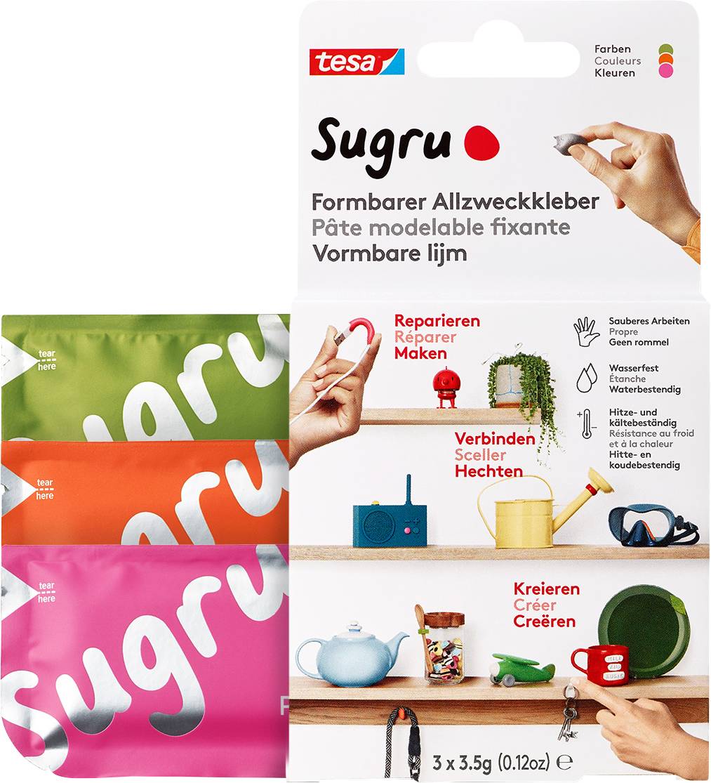 Wie funktioniert Sugru? Sugru ist in 3,5-g-Einmalpackungen erhältlich. Beim ersten Auspacken ist Sugru weich und formbar wie Spielknete. Sie haben 30 Minuten zum Reparieren, Verbinden, Montieren, Verändern, Kreieren, Verbessern, Upcycling und Personalisieren – genug Zeit, um Sugru nach Bedarf neu zu positionieren und alles perfekt abzuschließen. Einfach ankleben, mit der Hand formen und 12 bis 24 Stunden warten, bis Sugru zu einem griffigen Silikongummi aushärtet. Und falls Sie es sich anders überlegen sollten, können Sie Sugru von nicht porösen Oberflächen mit einem Messer oder Skalpell entfernen. Nach dem vollständigen Aushärten bleibt Sugru dauerhaft in seiner Position und behält seine Form. Sugru passt sich dem Material optimal an und kann daher auch eingesetzt werden, wenn das Material flexibel bleiben muss. Dabei ist Sugru unglaublich stark. Eine Einmalpackung kann das 600-Fache ihres eigenen Gewichts halten (3,5 g*) Sugru ist deshalb ideal zum Montieren von Gegenständen geeignet! Das neue Sugru kombiniert die Vorteile beider bisherigen Produktformeln (Original und Familienfreundlich). Sugru bietet alle Vorzüge des revolutionären Materials mit all seinen unglaublichen Eigenschaften und ist dabei noch besser, leichter anzuwenden, vielseitiger und kreativer einsetzbar! Sugru ist in 10 Farben erhältlich: Schwarz, Weiß, Rot, Gelb, Blau, Grau, Grün, Braun, Orange und Pink. Alternativ lassen sich nicht ausgehärtete Sugru-Farben zu jeder beliebigen Farbe mischen.