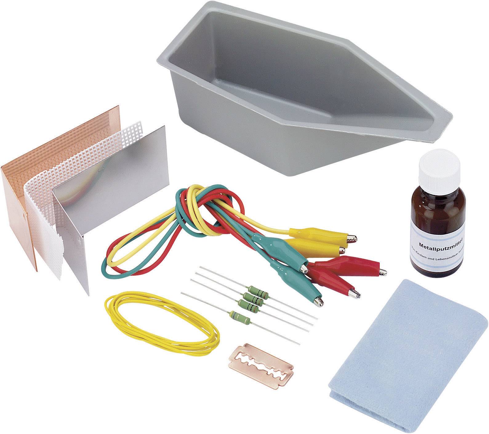 Es beinhaltet eine spezielle Plastik-Wanne (L x B x H) 165 x 77 x 52 mm · Edelstahl- und Kupfer-Anode · Isoliergitter (L x B) 114 x 45 mm · Kontaktdraht (L x Ø) 1 m x 0,8 mm · 3 Anschlussleitungen (L x Ø) 450 mm x 0,25 mm² · Metallputzmittel 15 ml · Poliertuch · 4 Widerstände (3 x 10 Ω u. 1 x 4,7 Ω, 2 W) · Probiermuster.