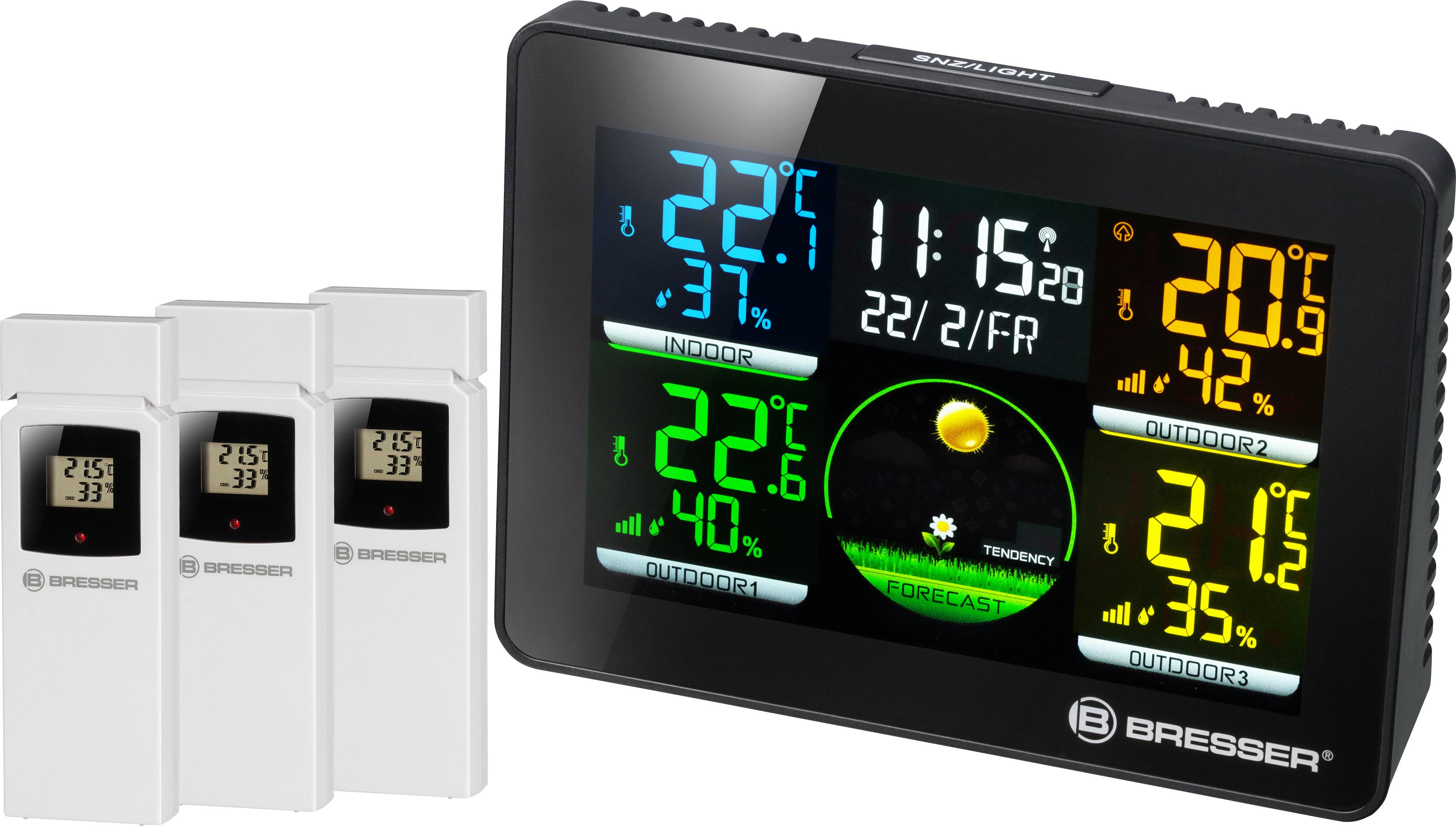 Das neue BRESSER Thermo Hygro Quadro NLX bietet wie unser Temeo Hygro Quadro (Art.-Nr.: 7000020000000) die Möglichkeit an 4 unterschiedlichen Messpunkten gleichzeitig die Temperatur und Luftfeuchtigkeit zu messen. Zusätzlich wird bei diesem Gerät auch der Wettertrend, sowie Uhrzeit und Datum auf dem übersichtlich gestalteten Farbdisplay angezeigt.