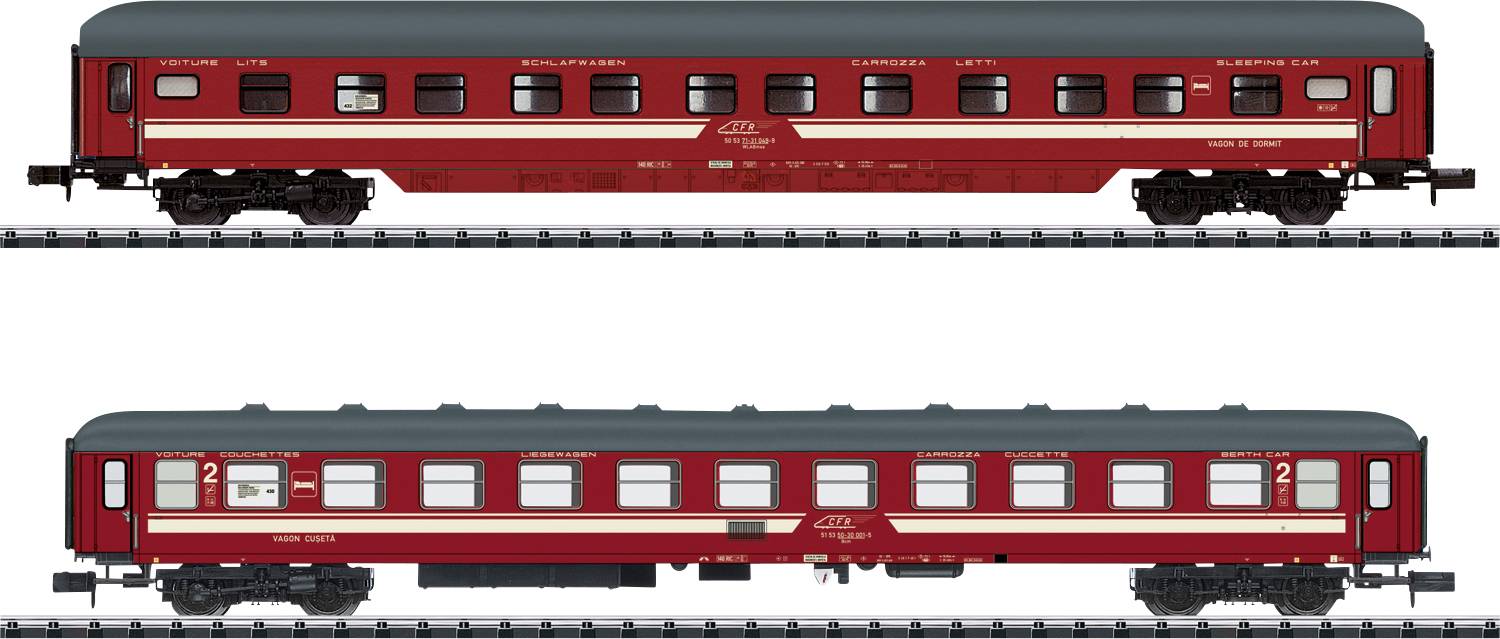 Vorbild: 1 Schnellzugschlafwagen WLABmee und 1 Liegewagen Bcm der Căile Ferate Române (CFR). Einsatz: Hochwertiger Fernverkehr, hier im EC "Venezia" um 2009.
