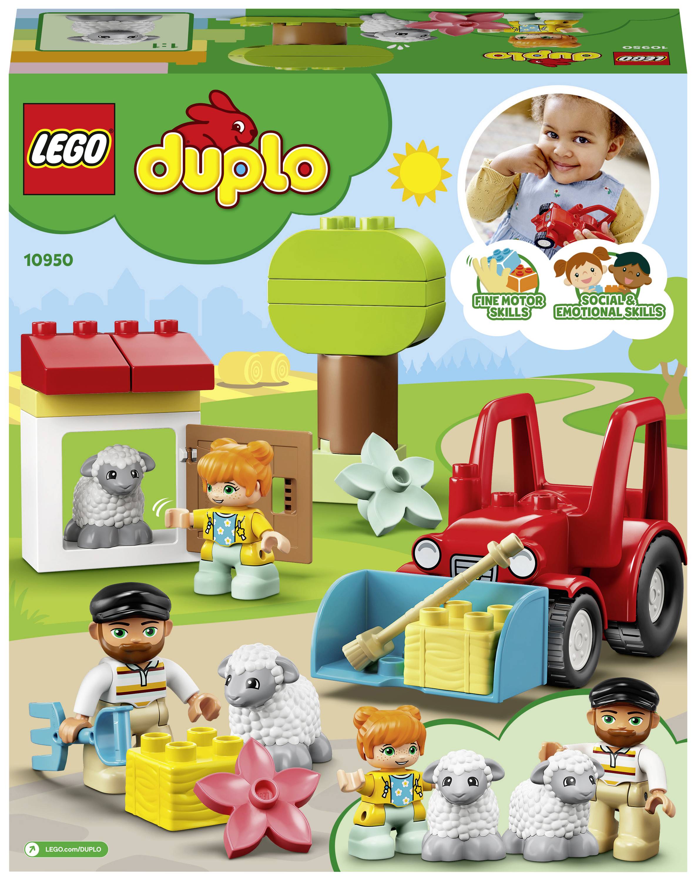 Begeistere dein Kind mit dem LEGO® DUPLO® Set „Traktor und Tierpflege“ (10950) für Spielspaß mit Traktoren und Tierpflege. Das vielseitige Spielset lässt Kinder kreativ spielen und wichtige Fähigkeiten entwickeln. Spielerisches Lernen auf dem Bauernhof Der Traktor zieht eine Karre mit Werkzeugen. 2 niedliche Schafe, ein Bauer und ein Kind sind ebenfalls enthalten. Aktivitäten wie das Füttern der Schafe lassen Kinder ganz spielerisch feinmotorische Fähigkeiten und sozial-emotionale Kompetenz entwickeln. Entwicklungsförderndes Spielzeug für Kleinkinder Mit LEGO DUPLO Spielzeug lernen Kinder ganz spielerisch. DUPLO Spielsets lassen Eltern und Kleinkinder miteinander spielen und wichtige Entwicklungsschritte gemeinsam erleben.