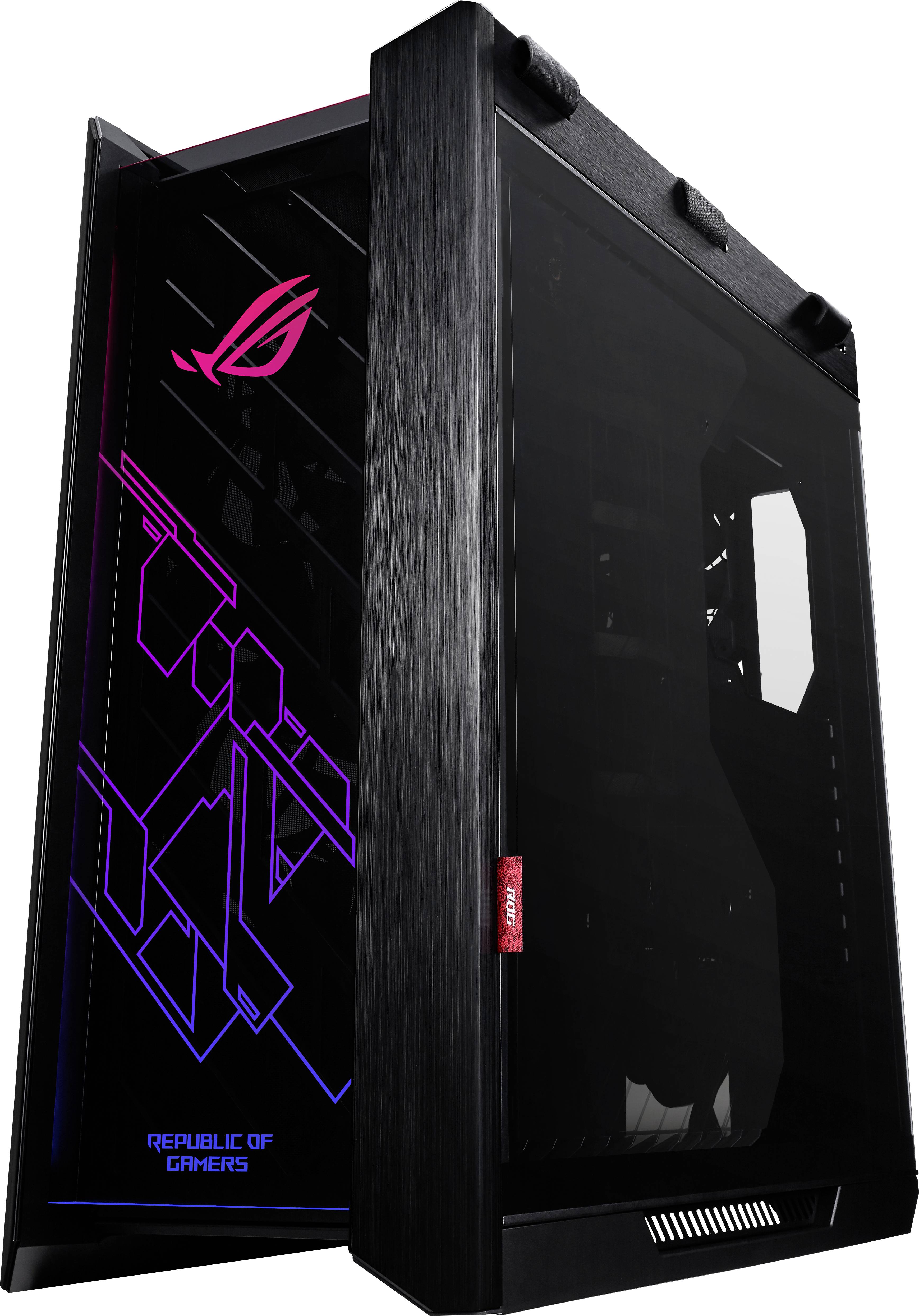 Premium-Design & -Optik Maßgeschneidert für Showcase-PCs, mit drei Fenstern aus gehärtetem Glas, einem Rahmen aus gebürstetem Aluminium und integrierter AURA-Sync-RGB-Beleuchtung an der Vorderseite.