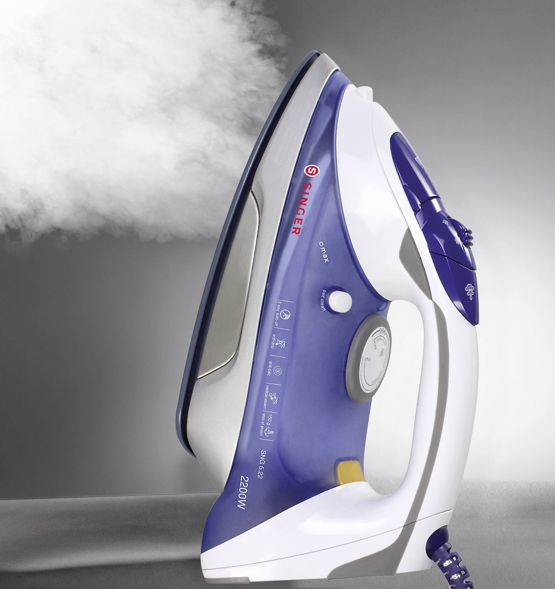 Bügeln mit dem SINGER® Dampfbügeleisen SNG 5.22. Noch mehr Leistung für wenig Geld. Durch die Form und das Gewicht ist das Bügeleisen angenehm und leicht zu handhaben. Ihre Wäsche ist im Nu glatt und keimfrei.