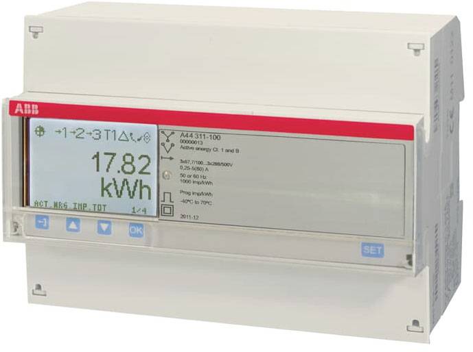 Drehstromzähler zur Messung eines Dreileiter- oder Vierleiter-Drehstromnetzes über einen Wandler-Anschluss CTVT (Wandlerverhältnis für Strom und Spannung konfigurierbar) bis maximal 6 A. Folgende Werte werden über ein weiß hinterleuchtetes Display mit bis zu 7 Stellen ausgegeben: Wirkenergie (Klasse 1) und Blindenergie (Klasse 2) für Import und Export, Leistungen, Ströme, Spannungen (L-L; L-N), Frequenz, cos phi, Power Faktor und Scheinleistung, sowohl je Phase als auch gesamt. Die Kommunikation kann über die integrierte Infrarotschnittstelle zur Anbindung eines KNX-Moduls erfolgen. Der Energiezähler hat 2 fest konfigurierte Ein- und Ausgänge. Der Ausgang kann wahlweise als Impulsausgang oder als Alarmausgang verwendet werden (bis zu 25 Alarmwerte). Die Eingänge dienen zur Steuerung der Tarife bzw. zur Zählung externer Impulse. Der rücksetzbare Zwischenzähler ermöglicht das Messen individueller Intervalle. Zusätzlich erfasst der Zähler bis zu 4 Tarife. Zähler ist geeicht nach MID und zugelassen gemäß IEC. Die Einbaubreite beträgt 7 DIN-Module.