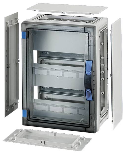 Gehäuse mit Tür für den Bau von Installationsverteilern bis 250 A für die Bedienung durch Laien nach IEC 61439-3. Offene Gehäusewände für die Kombination oder als Einzelgehäuse mit Verschlussplatten. Aus hochwertigem Polycarbonat, schutzisoliert. Schnelle Gehäuseverbindung durch Steckverbinder und integrierte Dichtungen. Große Wanddurchführungen für die elektrische Verbindung der Gehäuse untereinander. Kabeleinführung über Flansche. Wandbefestigung direkt am Gehäuse, über Außenlaschen oder mit Montageschienen. Automatengehäuse mit 24 Teilungseinheiten zum Einbau von Reiheneinbaugeräten nach DIN 43880. Mit PE- und N-Klemmen für Kupferleiter. N trennbar für unterschiedliche Potenziale. Mit Abdeckstreifen zum Verschließen von nicht benutzten Geräteausschnitten und Beschriftungsstreifen für die Stromkreiskennzeichnung. Transparente Tür und plombierbarer Türverschluss mit Handbetätigung. Mit Verschlussplatten-Set.