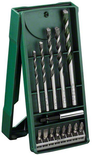 Mini-X-Line-Universalbohrer-Set. 14-teilig. Der leistungsstarke Universalbohrer. Ein robuster Spiralbohrer aus Hochleistungsschnellstahl, hohe Elastizität und geringe Bruchgefahr dank warmverformter Herstellung. Universell geeignet für die unterschiedlichsten Metalle und Hartkunststoffe. Auf vielseitige Aufgaben bestens vorbereitet: Handliches, Universalbohrer-Set für Bohrungen in Fliesen, Holz, Stein, Beton und Metall. Inklusive 8 gängigen Schrauberbits und magnetischem Universalhalter. 5 robuste, langlebige Universalbohrer mit Durchmesser 3 / 4 / 5 / 6 /8 mm für präzise Bohrungen in Fliesen, Holz, Stein, Beton und Metall. Kein Bohrerwechsel erforderlich, da für alle genannten Materialien geeignet. Mit schlagbohrfester Bohrspitze für hohe Lebensdauer. 8 Schrauberbits (Philips, Pozidriv, , Längsschlitz) in den gängigsten Größen. Guter Halt der Schraube im Bit durch im Adapter integrierten Magneten. Praktisch untergebracht in der handlichen Sortierbox. Für alle Elektrowerkzeugmarken geeignet.Inhalt des Sets: 5 Universalbohrer mit Durchmesser: 3 / 4 / 5 / 6 / 8 mm, 8 Schrauberbits, Länge: 25 mm, PH ½, PZ ½, S 0.5 x 4, S 1.0 x 6, T 20, T 25, 1 Universalhalter, magnetisch. Hinweis: Beim Metallbohren wird die Verwendung von Kühlflüssigkeit empfohlen, z. B. Bosch Universalschneideöl 2 607 001 409. Sicherheitshinweis: Bitte je nach Anwendung den entsprechenden Arbeitsschutz tragen: Metallbohren: Schutzbrille. Holzbohren: Schutzbrille und Staubschutzmaske. Steinbohren: Schutzbrille, Staubschutzmaske, Gehörschutz und Arbeitshandschuhe.