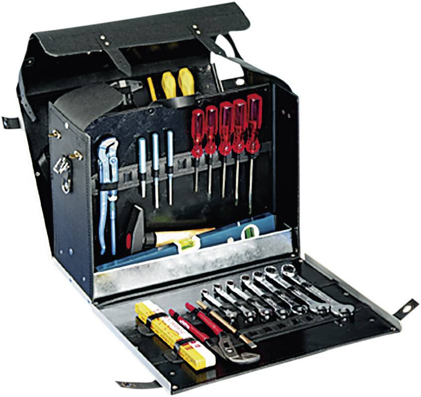 Vorder- und Rückwand aufklappbar · Mittelwand herausnehmbar · Bodenschale aus Stahlblech, verzinkt · Verstellbare Werkzeughalteschlaufen auf Vorder-,Mittel- und Rückwand, Ringkappen · Taschenkörper umlaufend mit Aluwinkeln verstärkt.